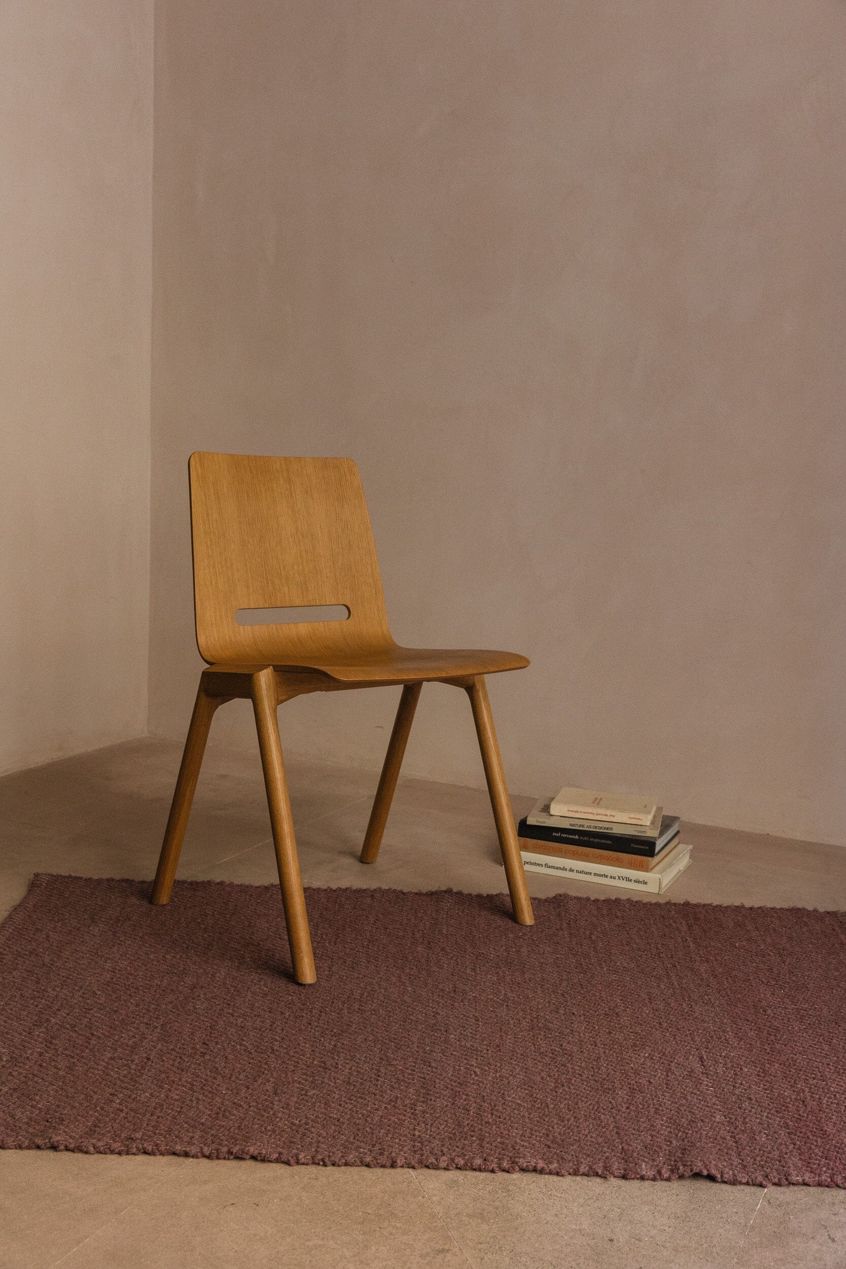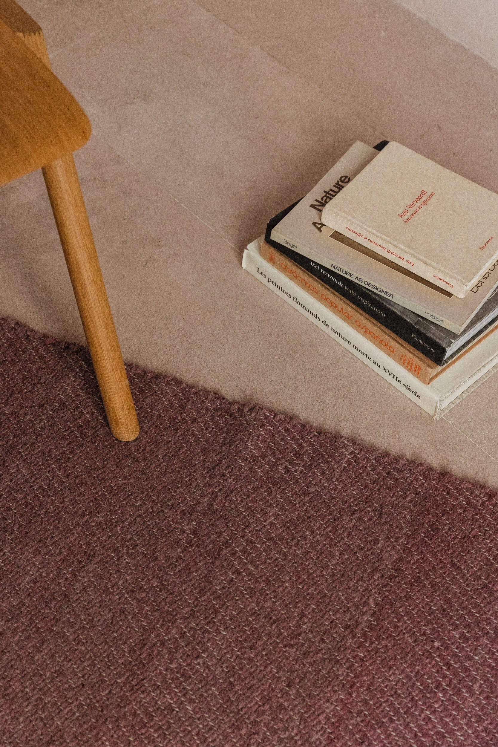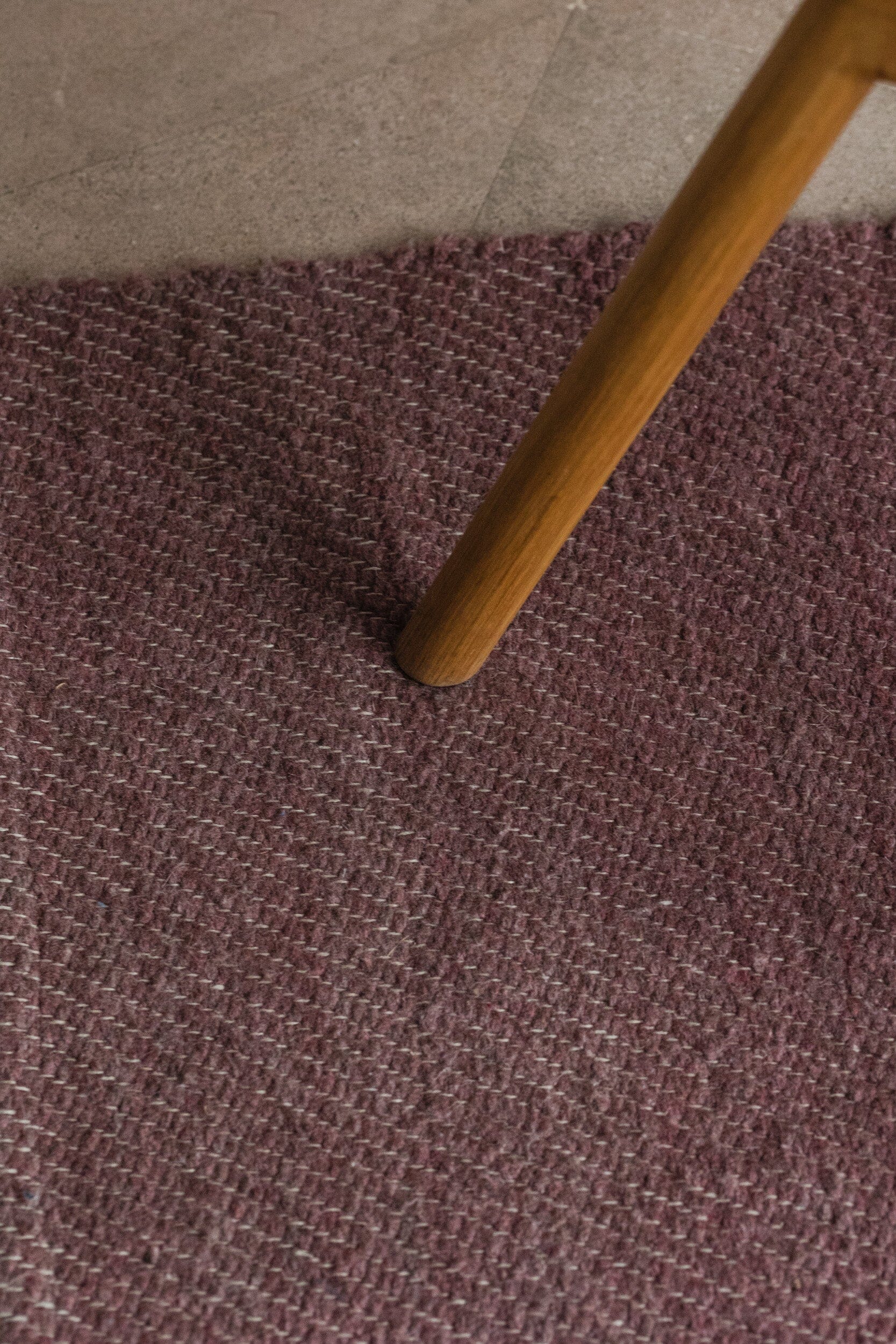 Pieza única tejida en espiga, con urdimbre de lino gris y trama de lana malva rosada, teñida con tintes naturales.