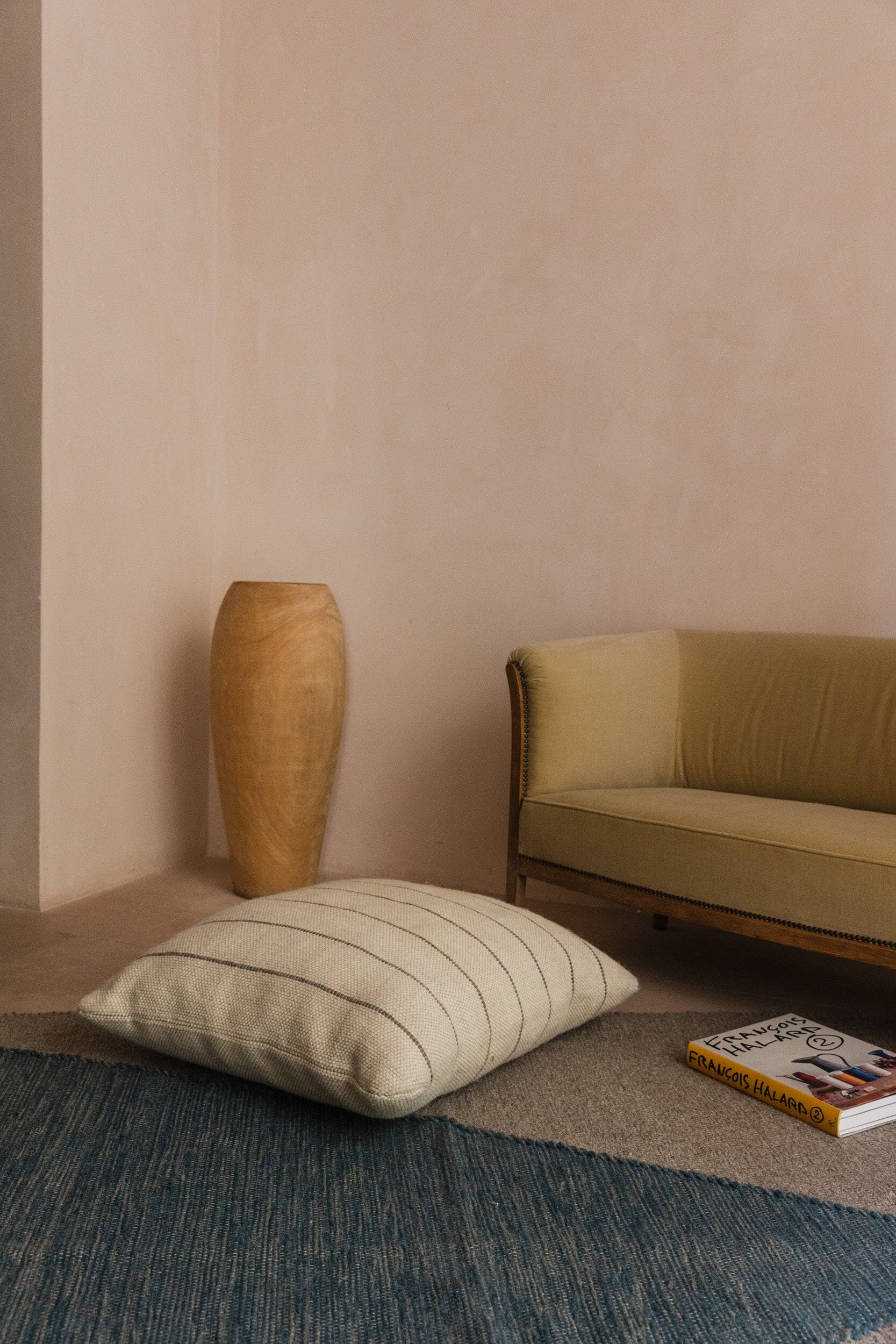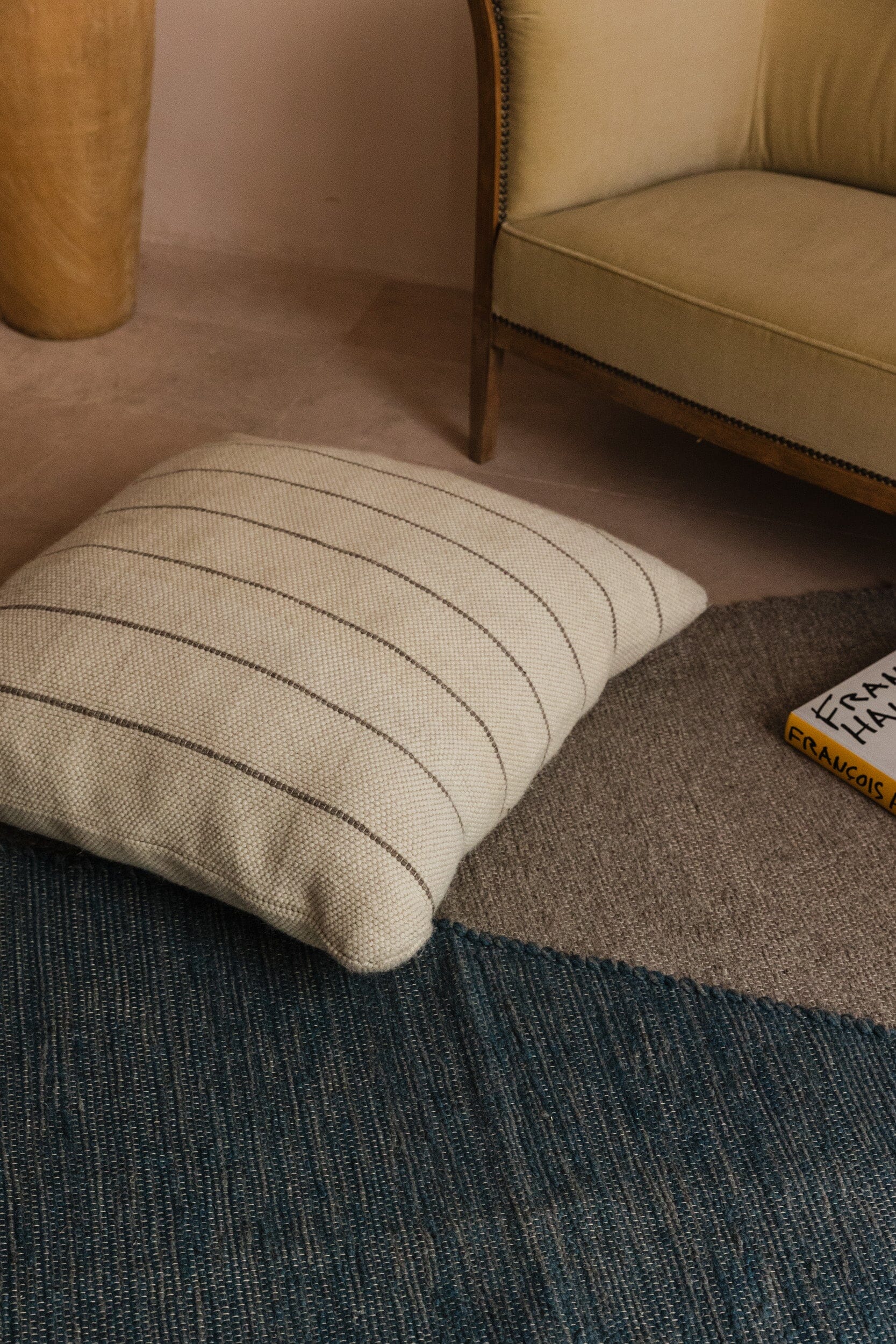 Pieza única en urdimbre de lino gris y trama de lana castellana cruda. Con diversas rayas en tono topo.