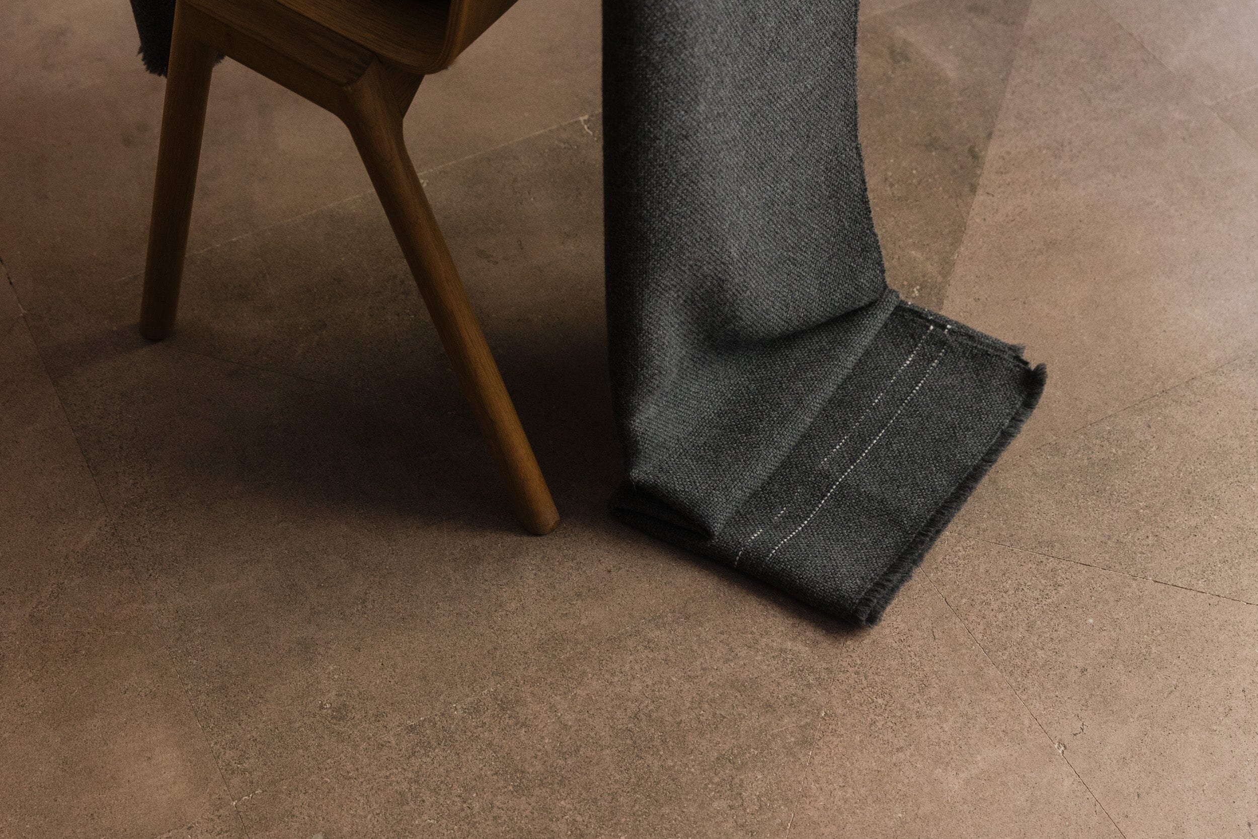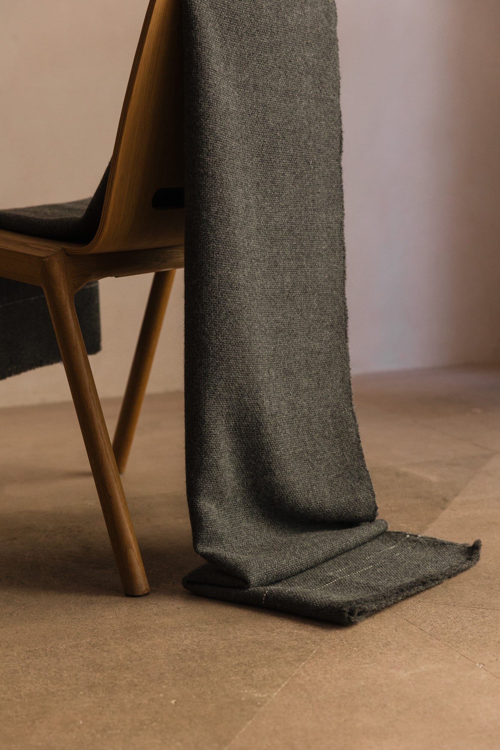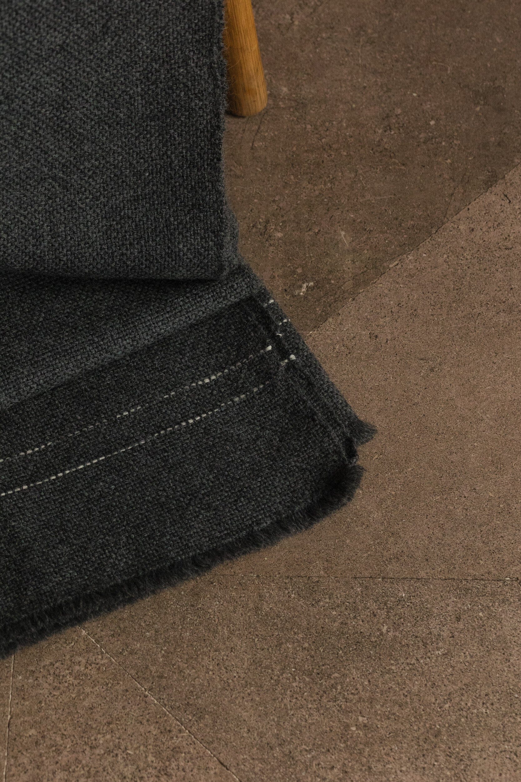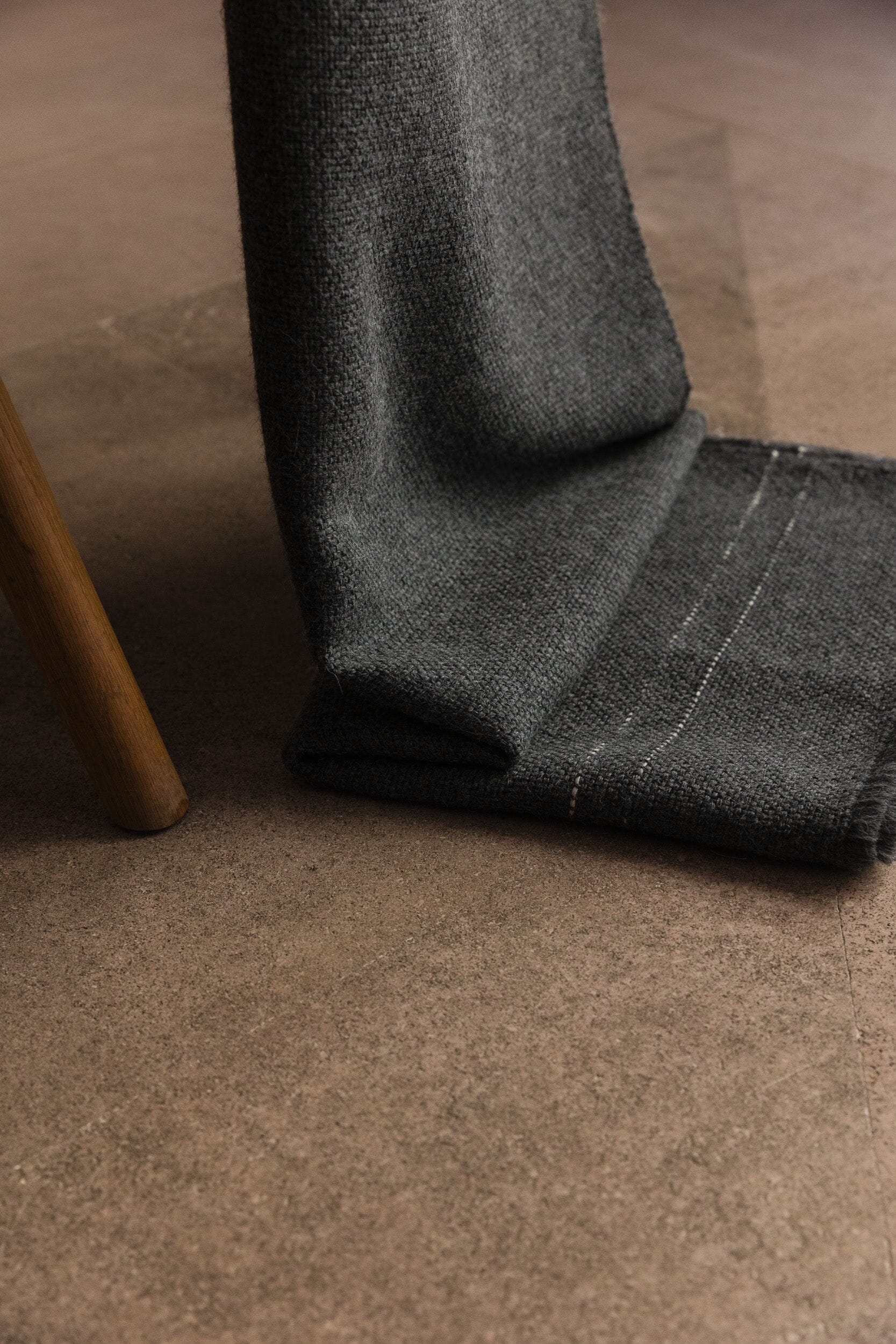 Pieza única en urdimbre y trama de alpaca negra antracita. Detalle de rayas finas de color blanco.
