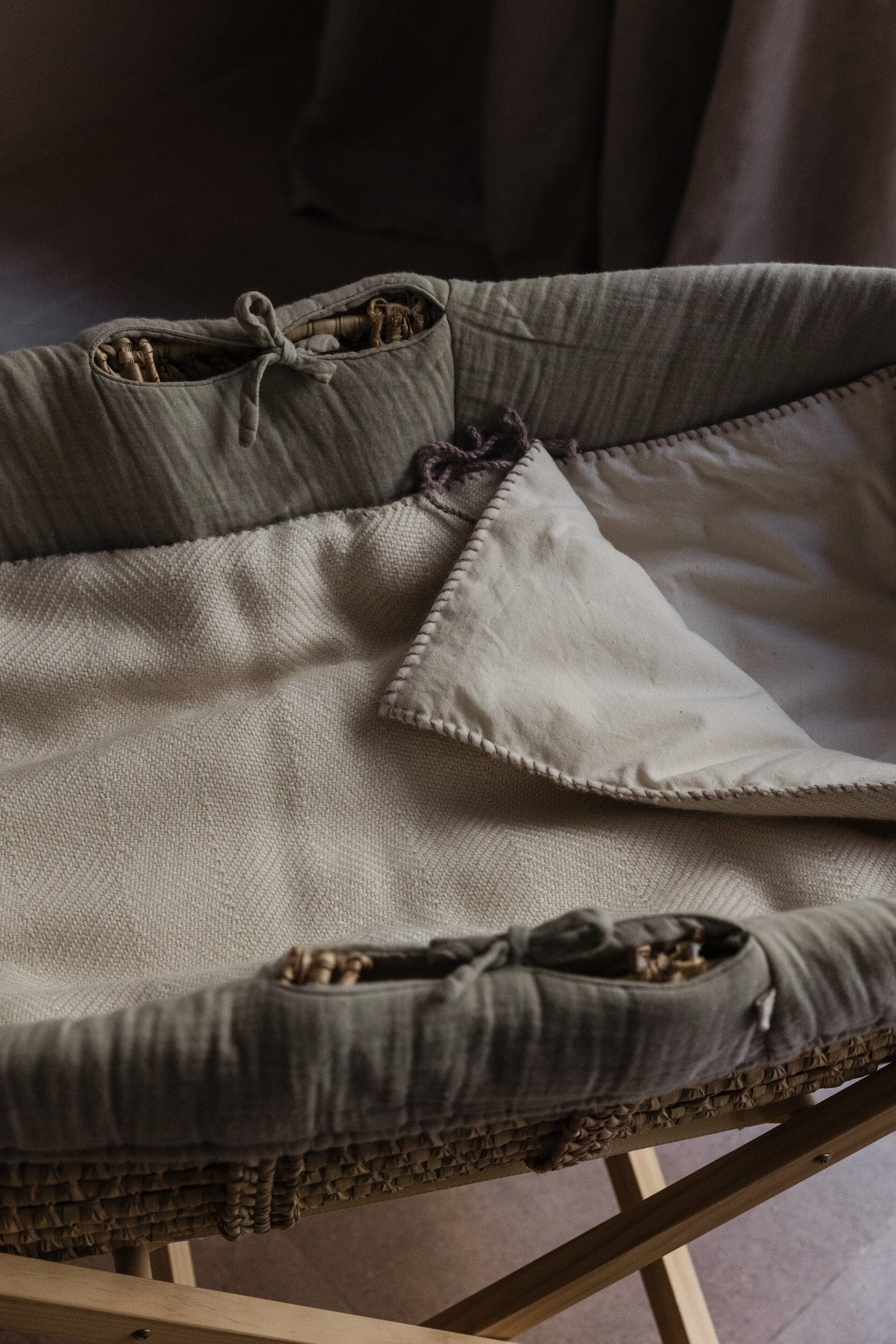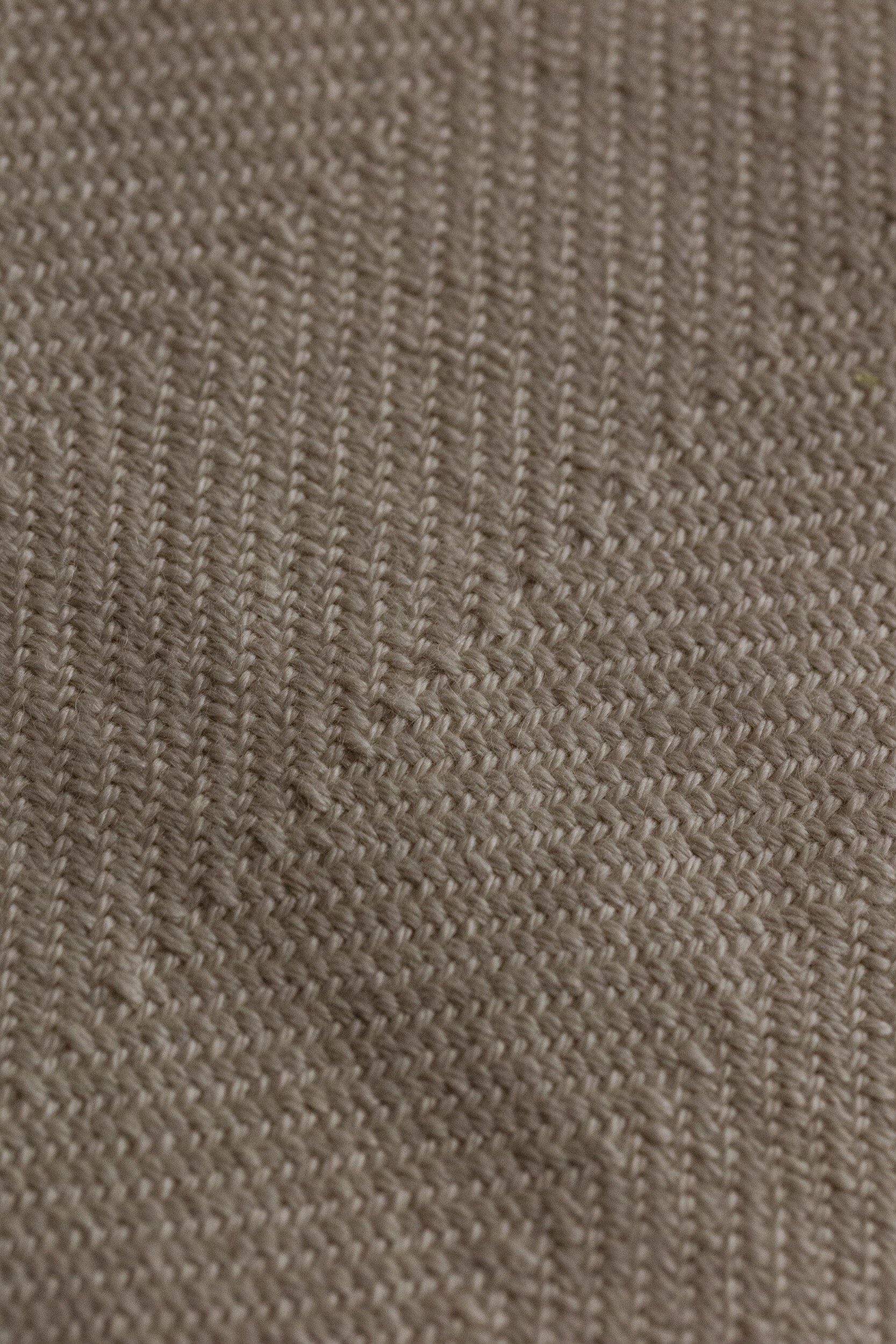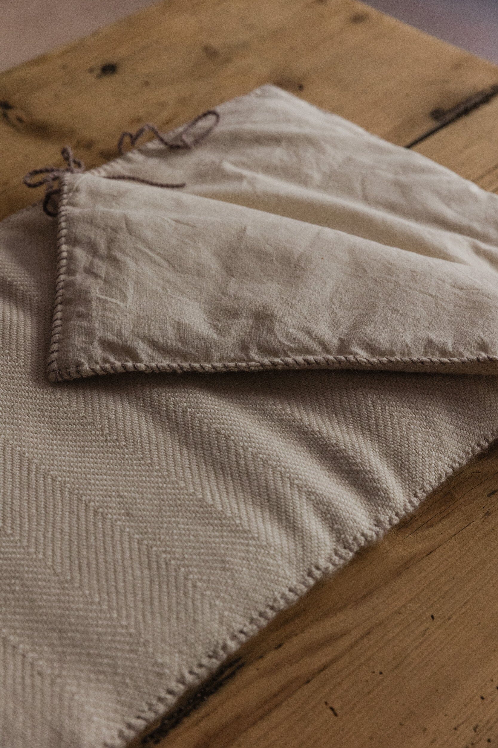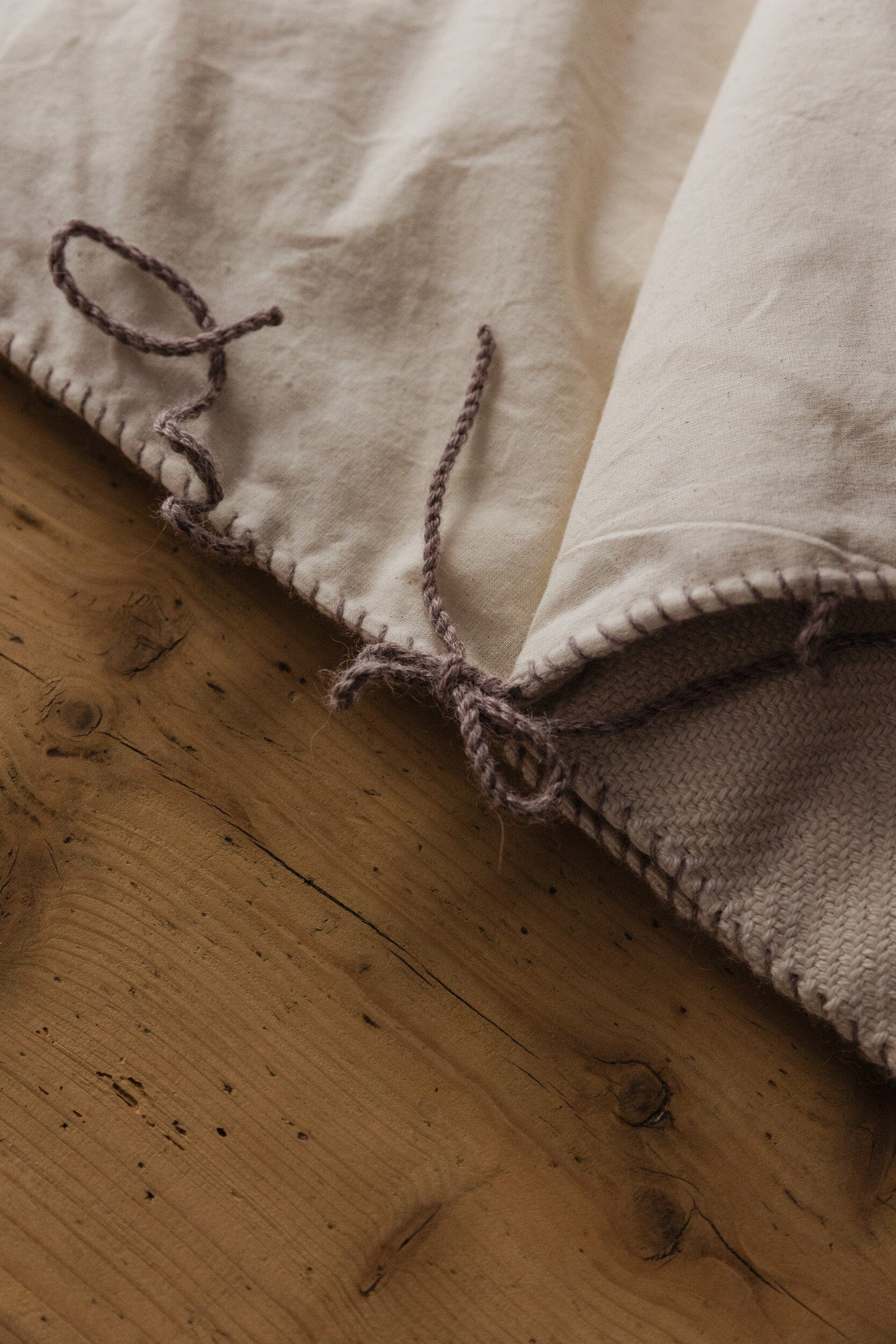 Pieza única en espiga con urdimbre y trama de alpaca baby con seda blanca. Con relleno de plumón. Con lazos de alpaca en tonos malva oscuro.