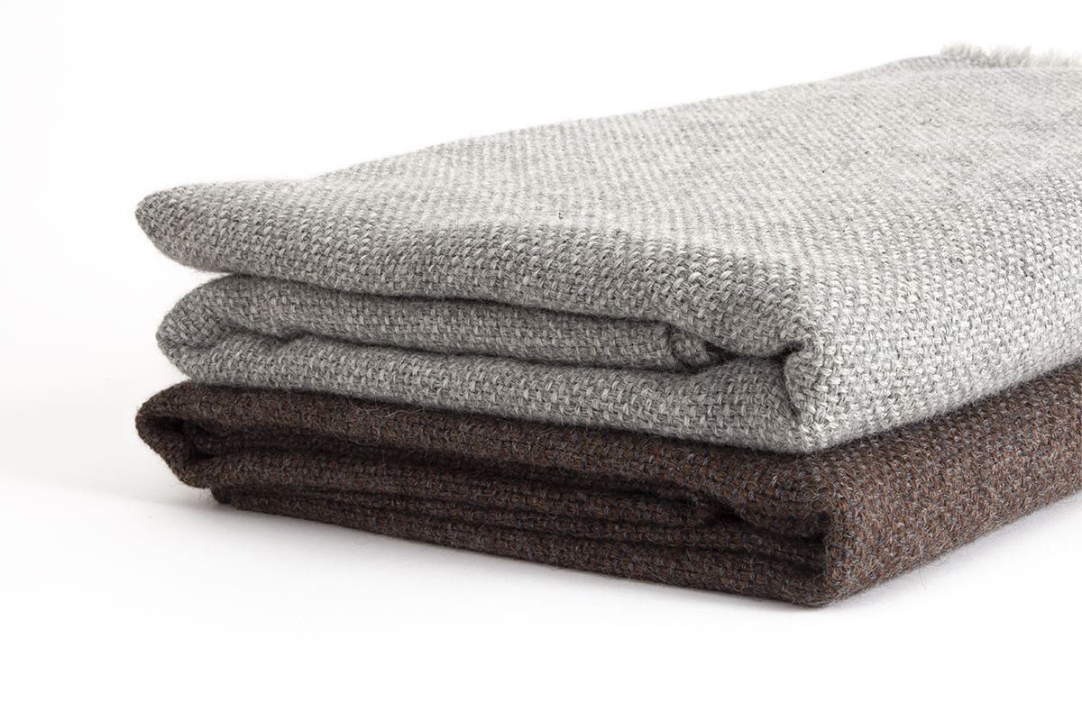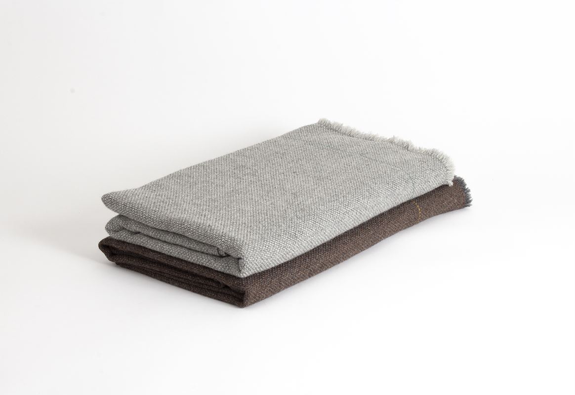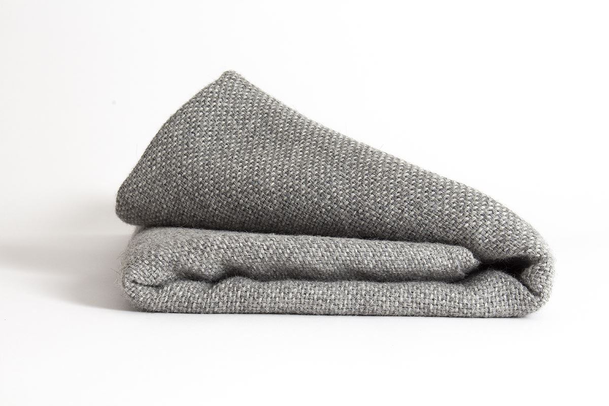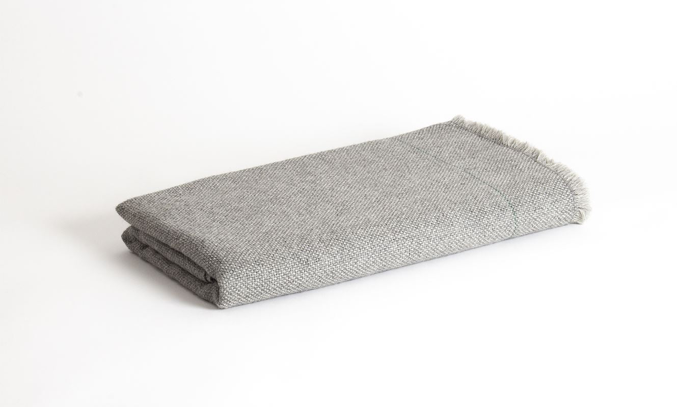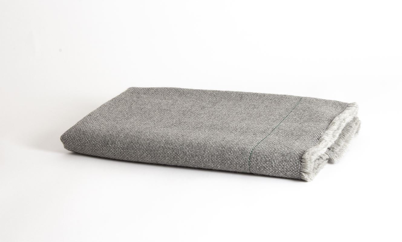 Exclusive piece, handcrafted from the finest natural fibers. Features a mist-grey alpaca warp and a rain-grey alpaca weft, finished with a celadon-green stripe.
