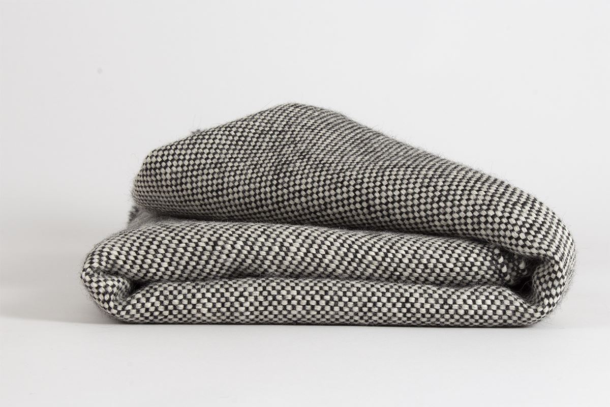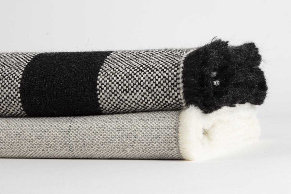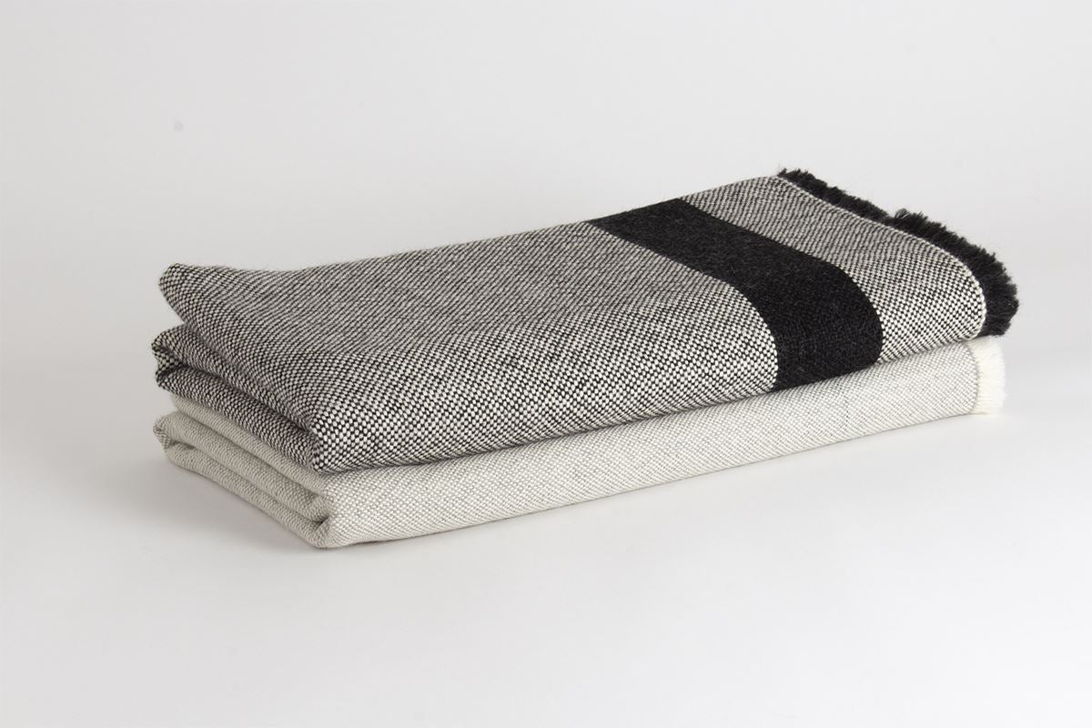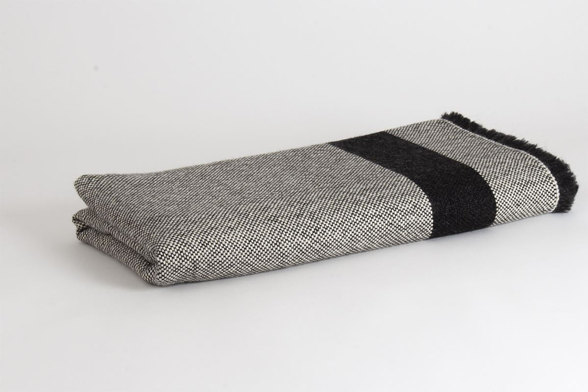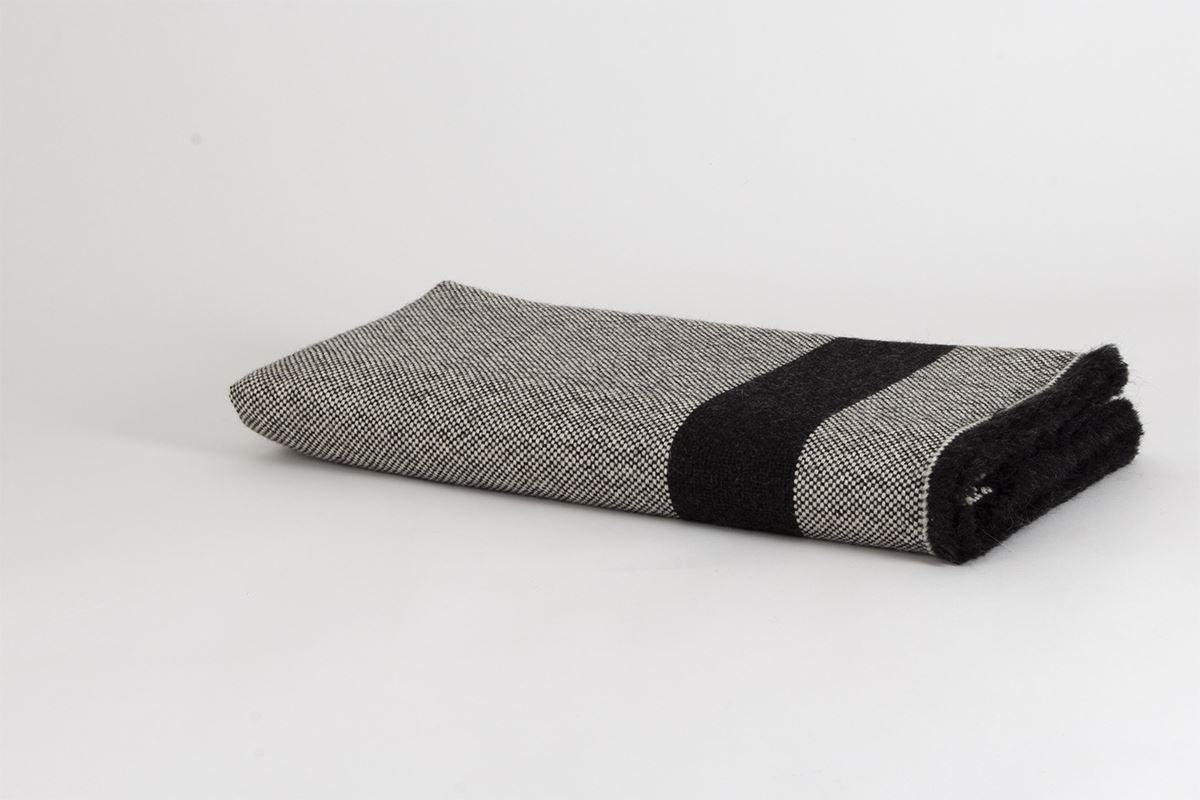 Exclusive piece, handcrafted from the finest natural fibers. Features an anthracite alpaca warp and a white alpaca weft, finished with a black stripe.