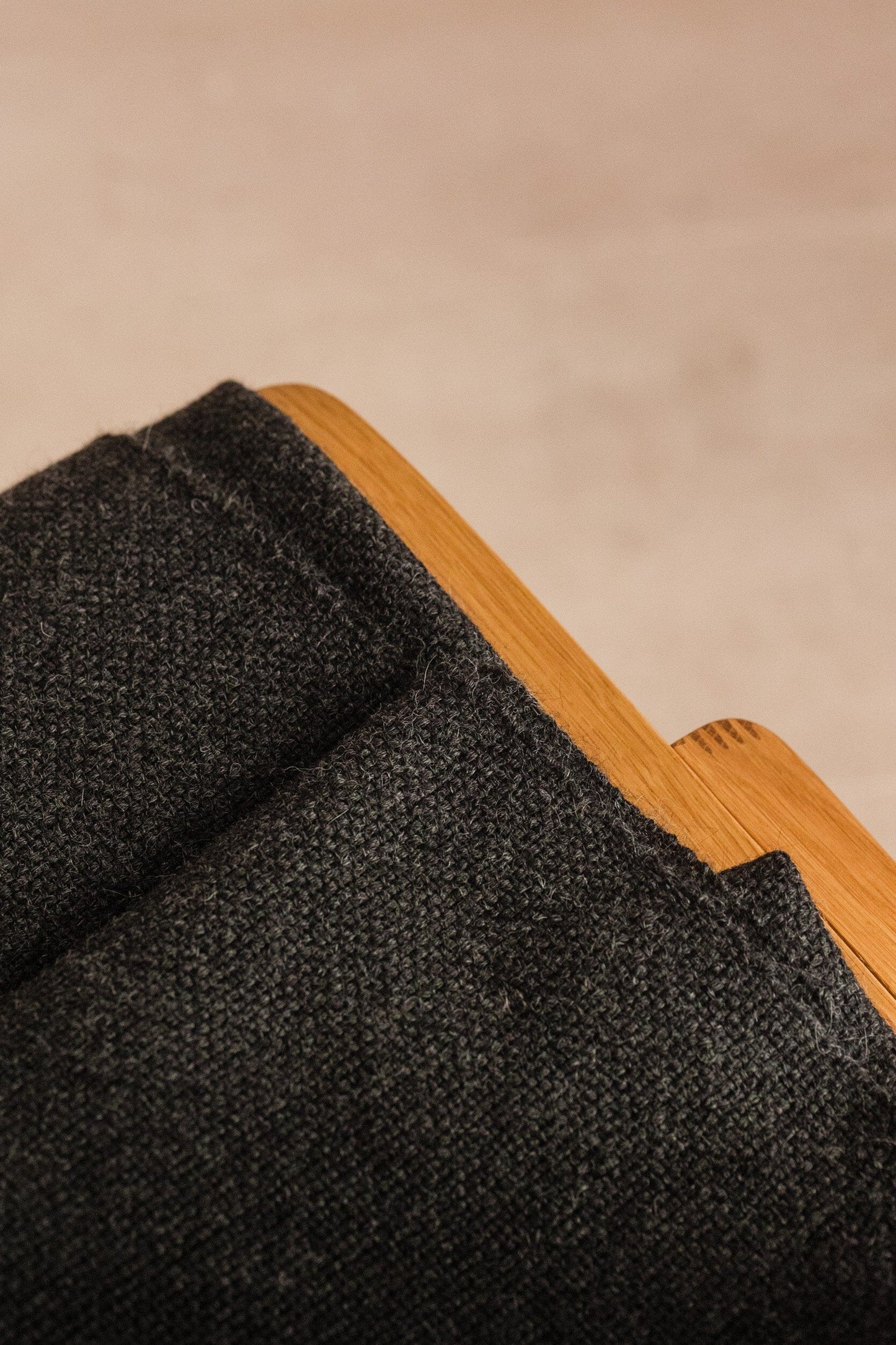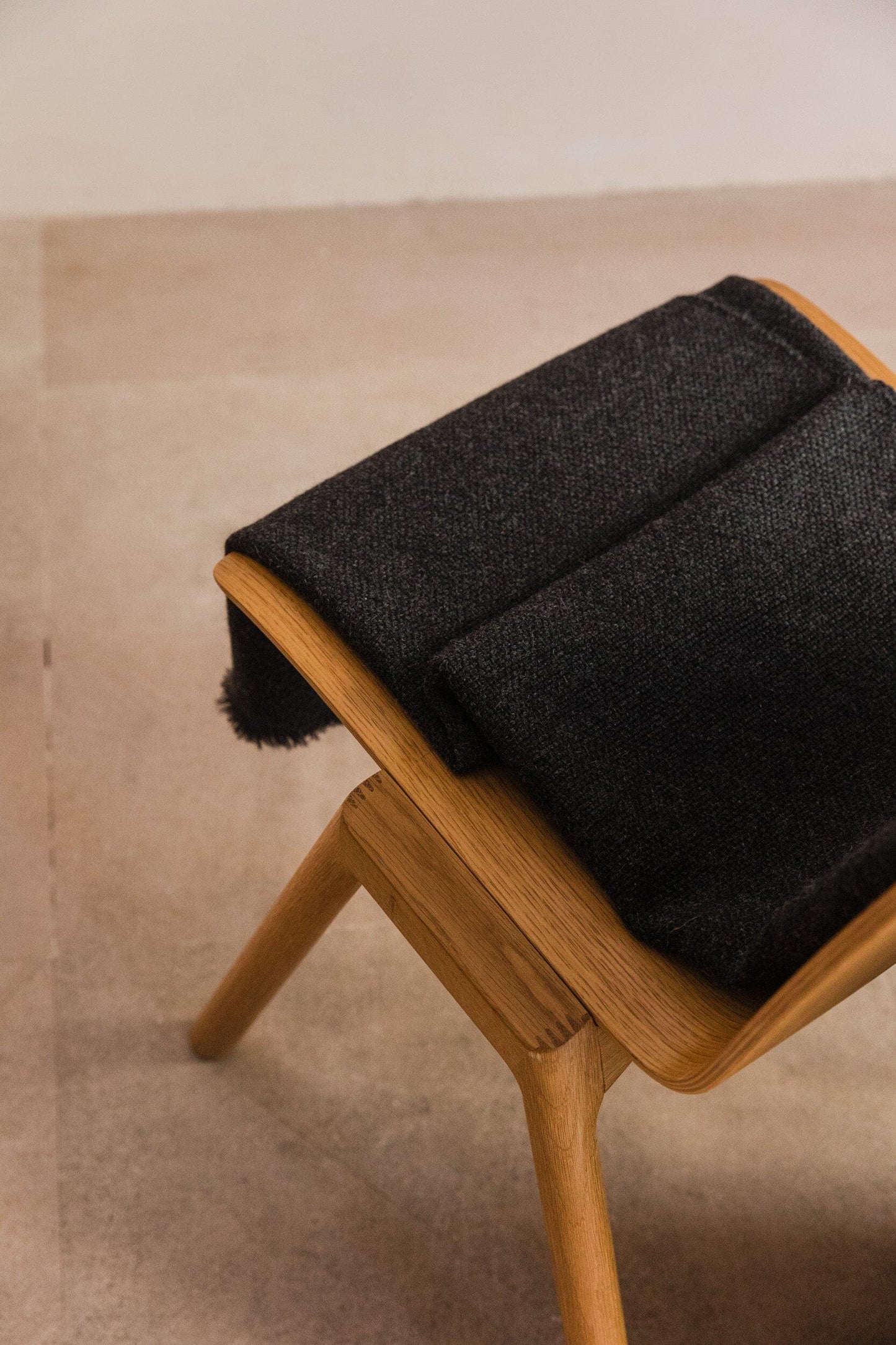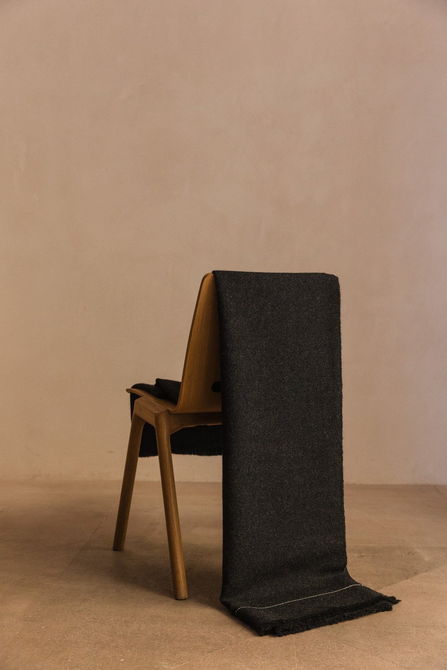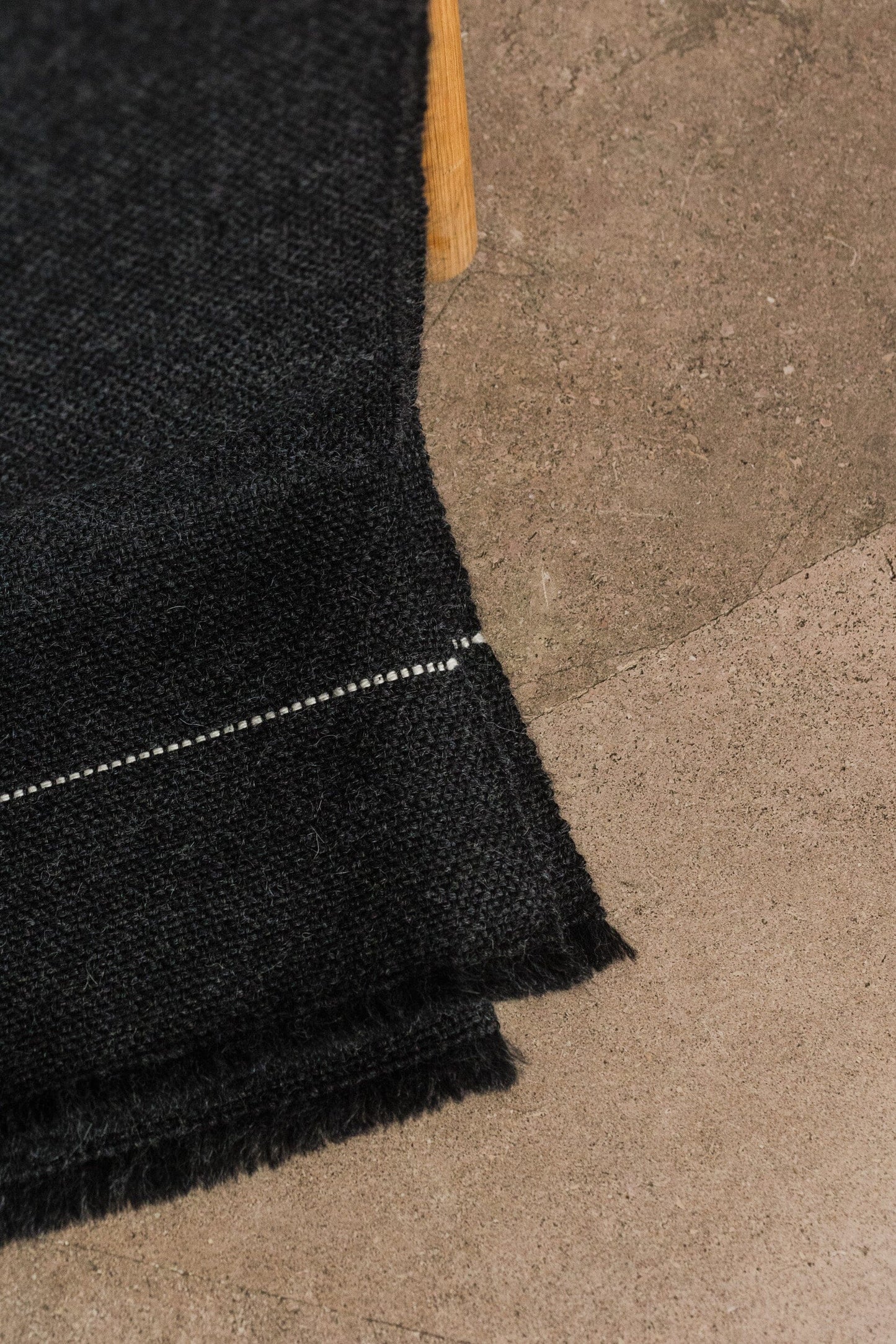 Pieza única en urdimbre y trama de alpaca negra antracita. Detalle de raya fina blanca.