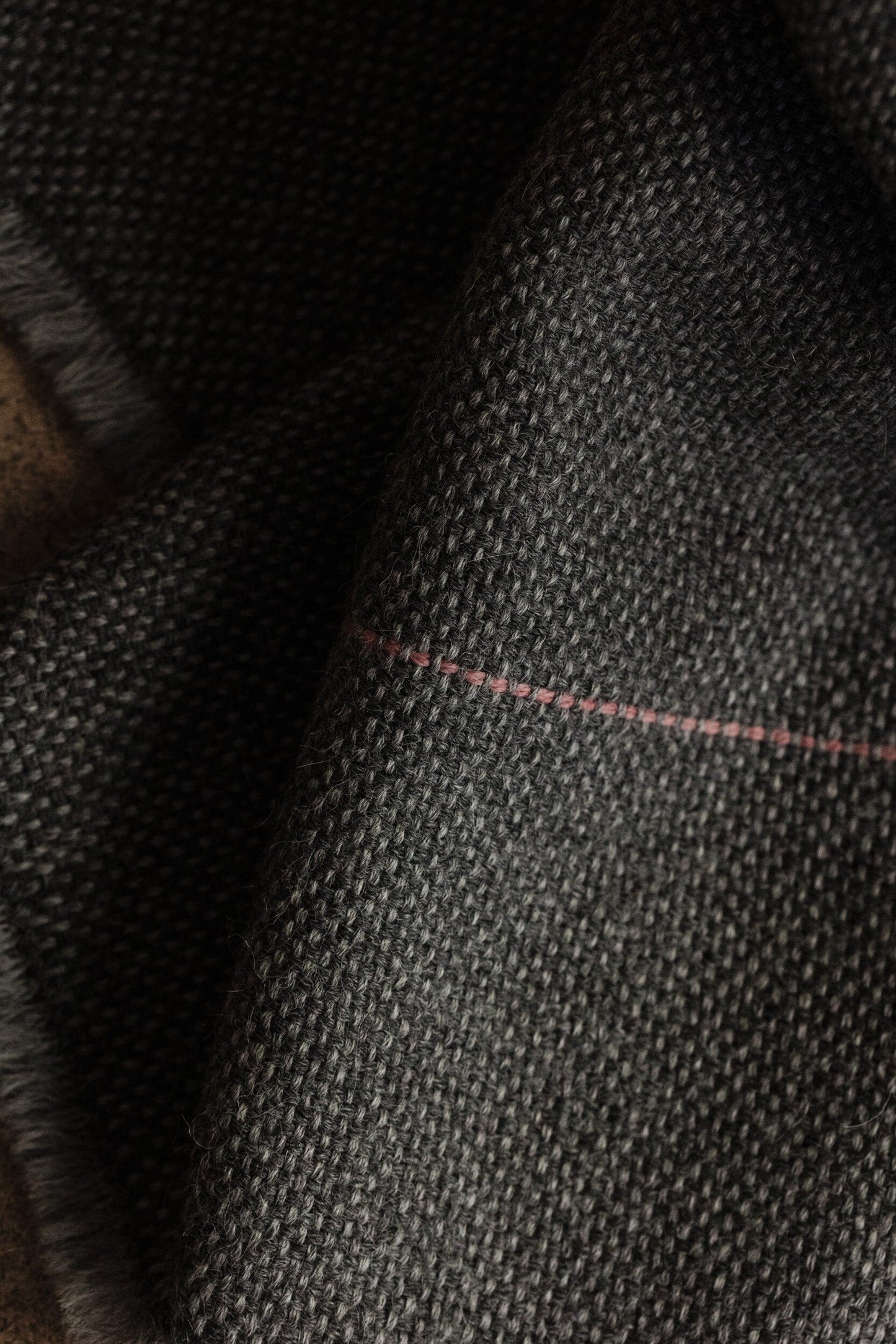 Pieza única con urdimbre de alpaca gris niebla y trama de alpaca gris lluvia. Con una raya fina en color rosa palo.