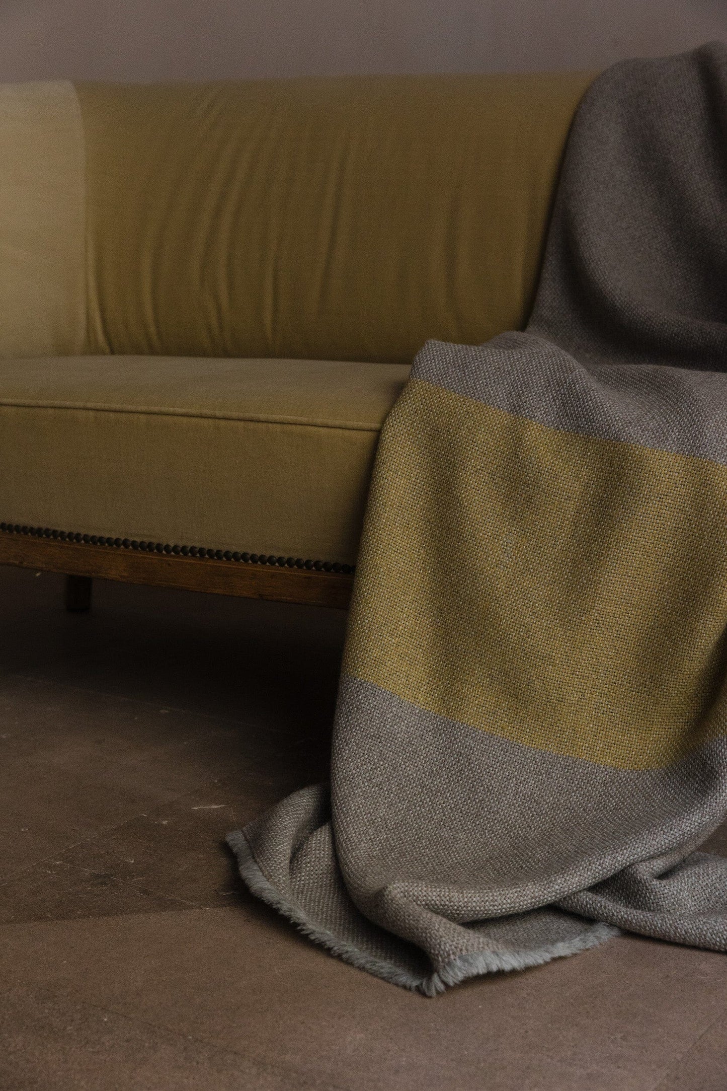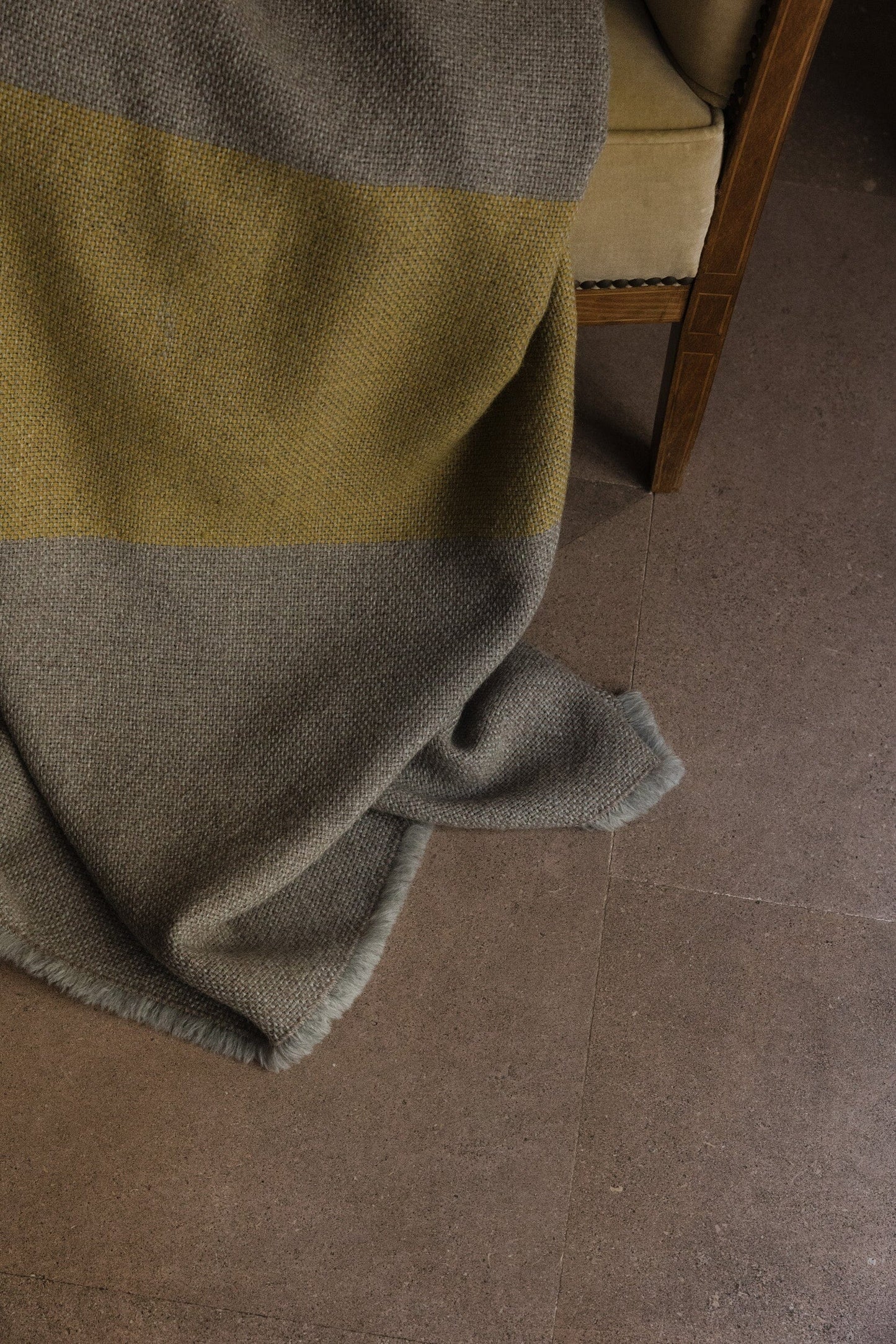 Pieza única en urdimbre de alpaca color gris niebla y trama de alpaca color arena. Con una franja gruesa en color mostaza.