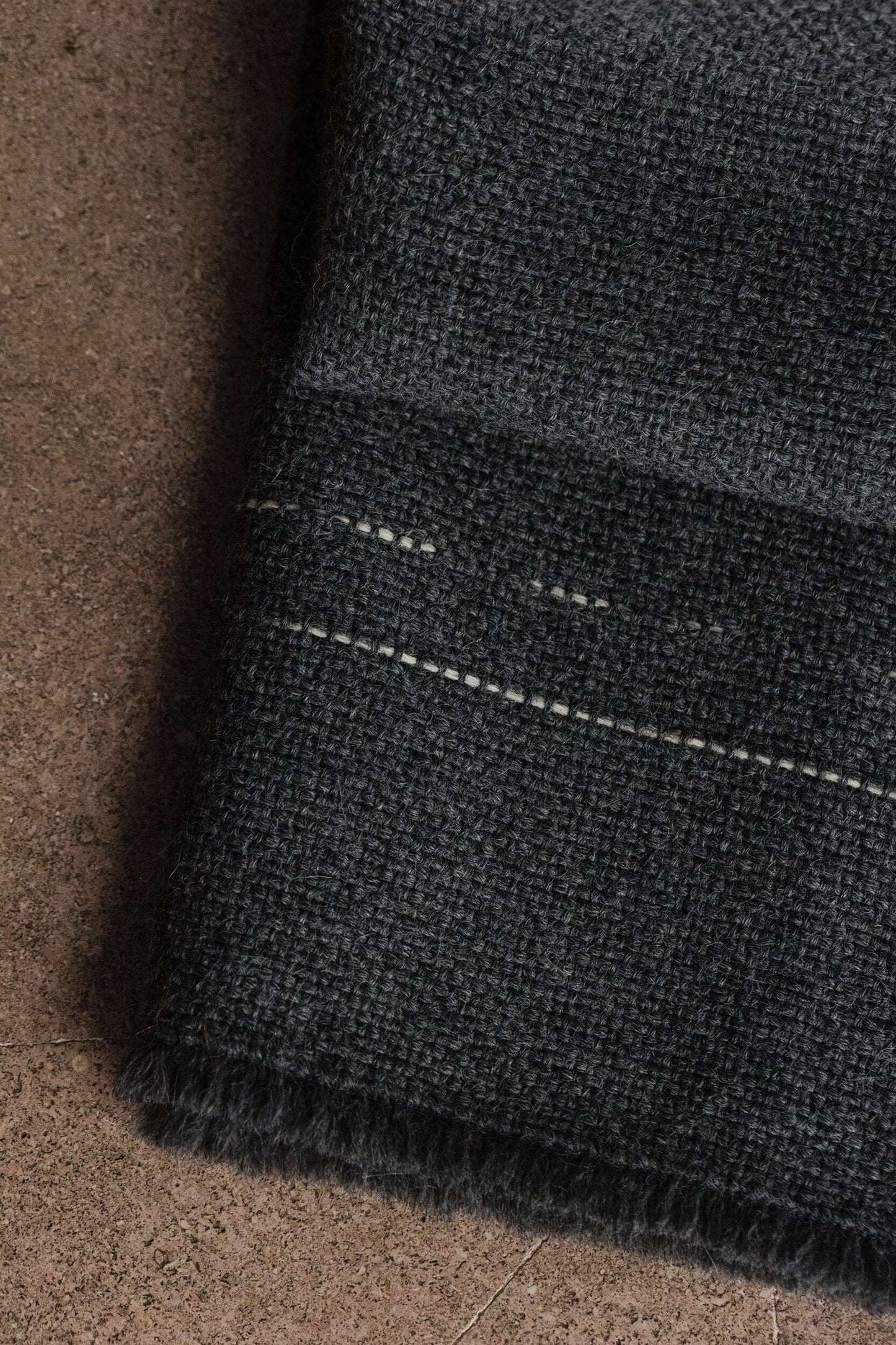Pieza única en urdimbre y trama de alpaca negra antracita. Detalle de rayas finas de color blanco.