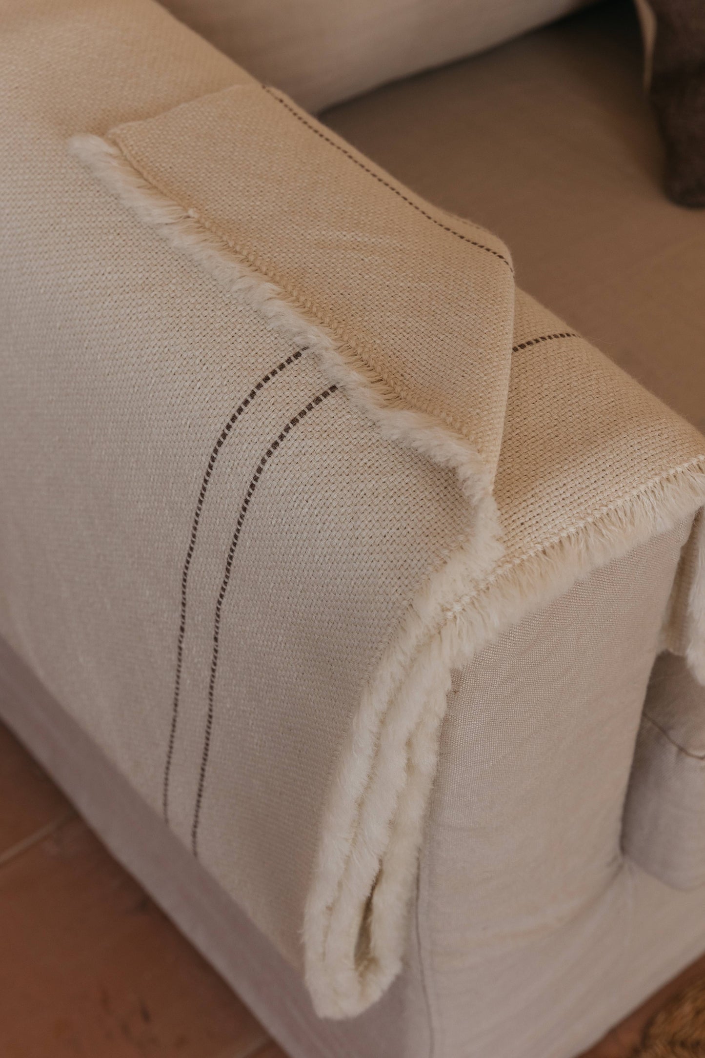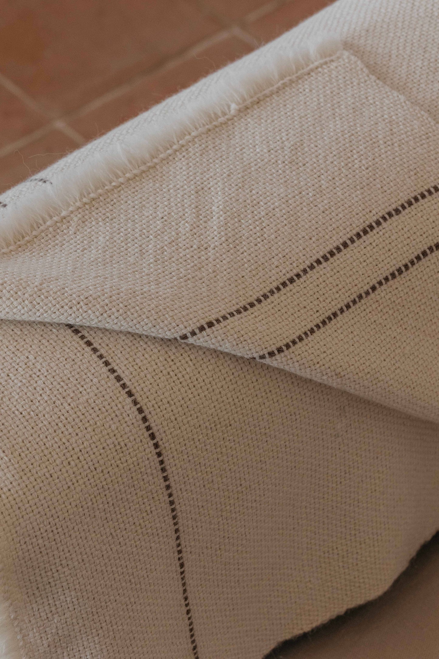Pieza única con urdimbre y trama de alpaca cruda. Decorada con varias rayas finas en color tabaco.
