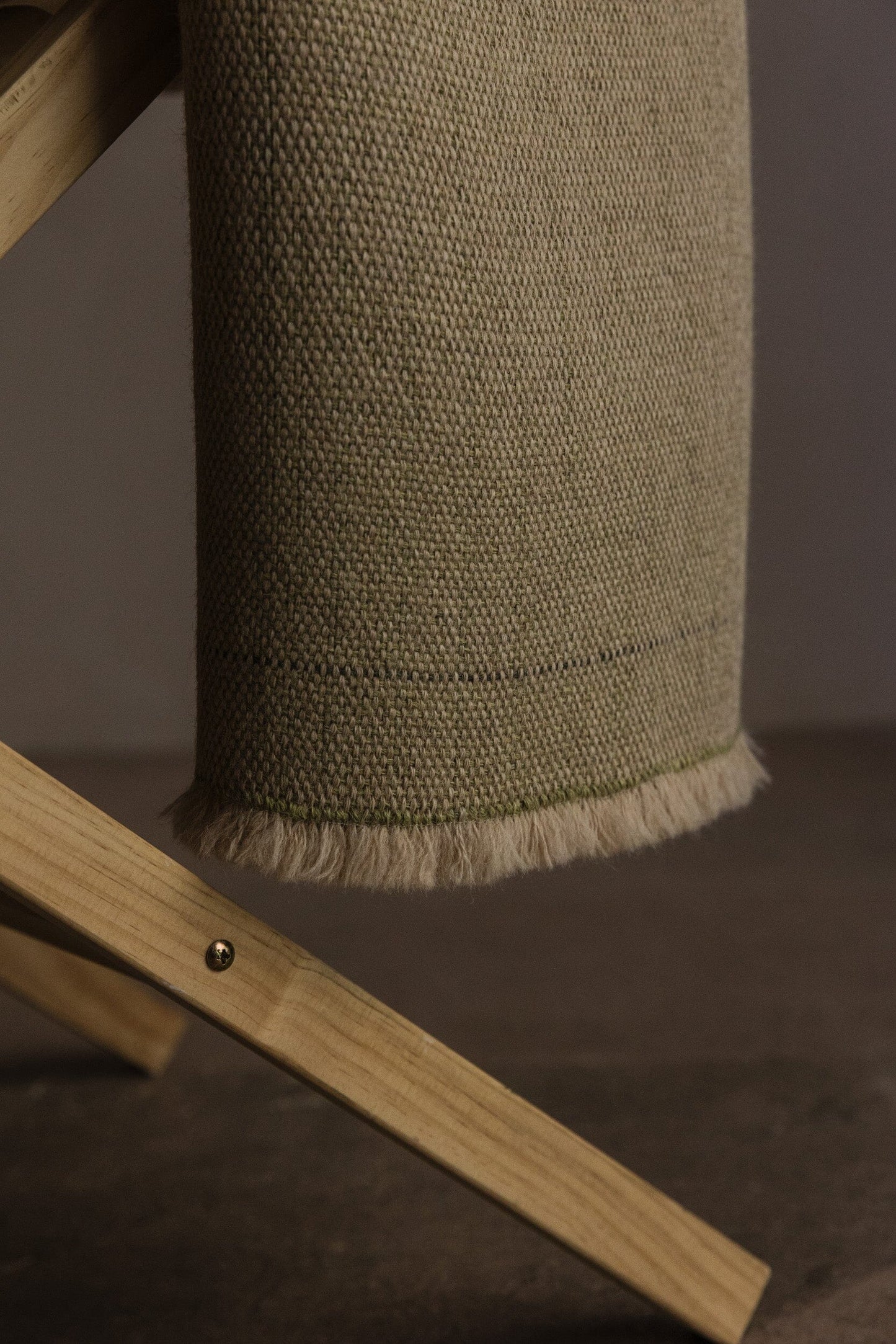 Pieza única en urdimbre de alpaca color nuez tostada y trama de alpaca gris verdoso, con tintes naturales.