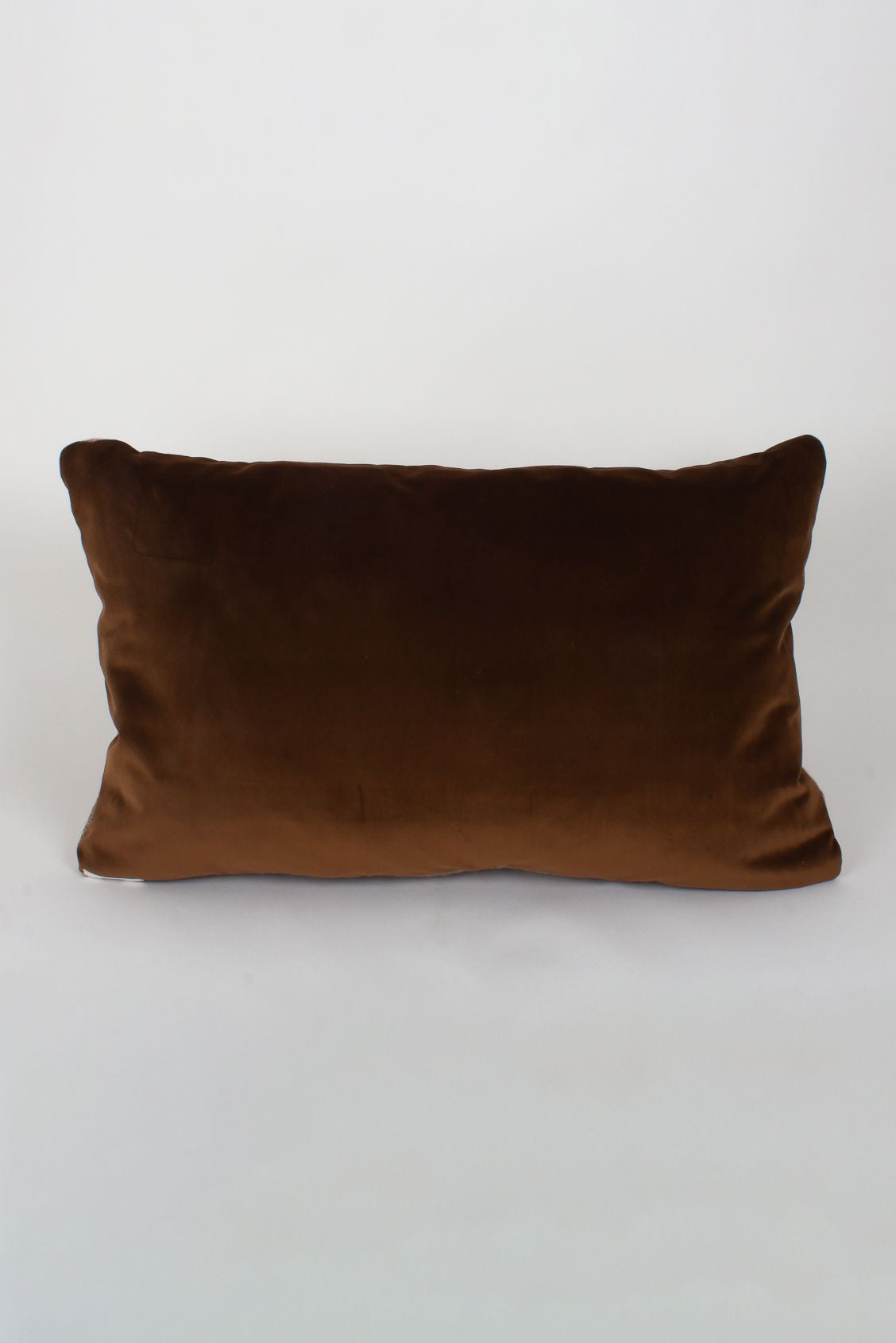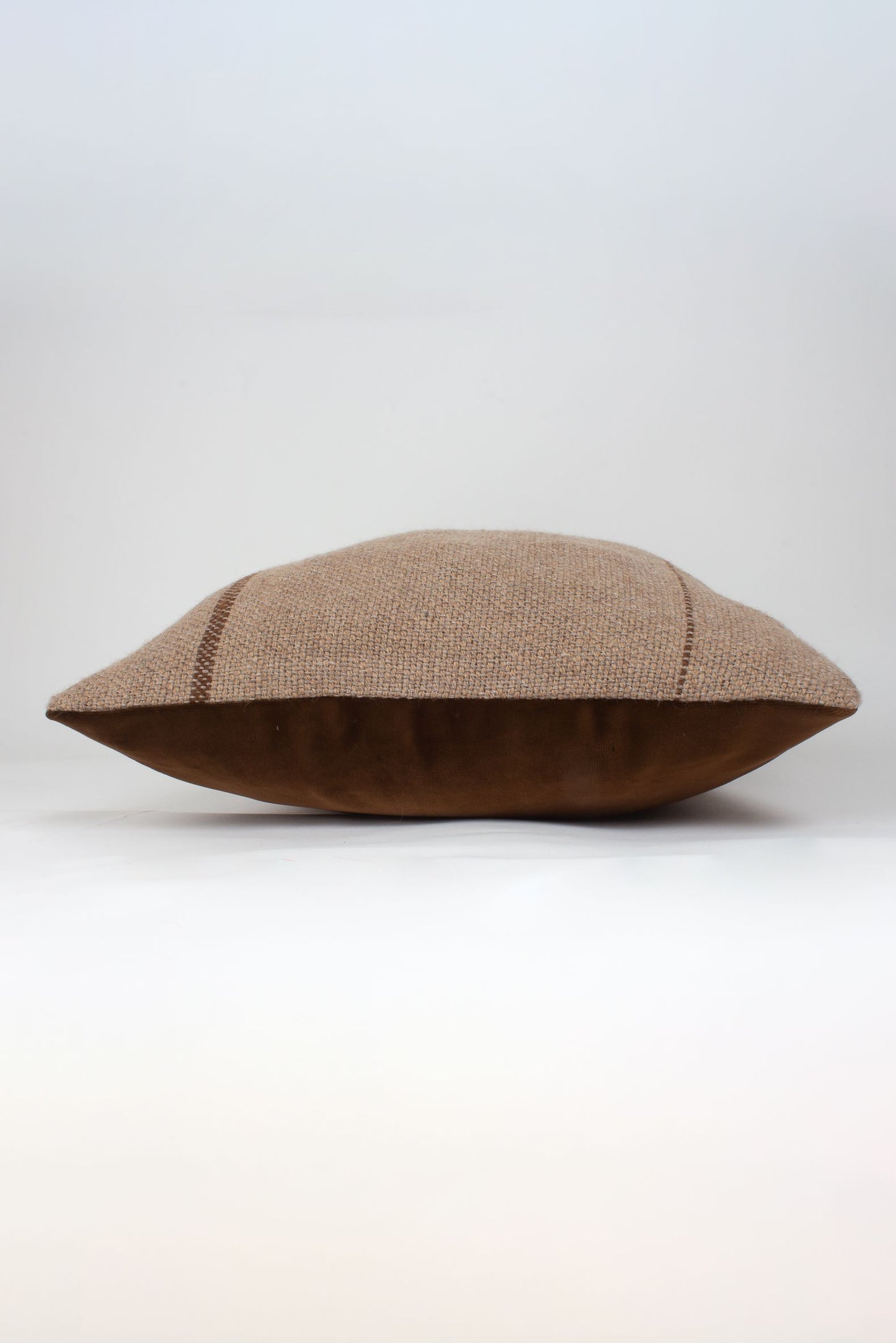 Unique piece with mist grey alpaca warp and toasted walnut alpaca weft. Decorated with tobacco brown stripes and back in tobacco velvet.