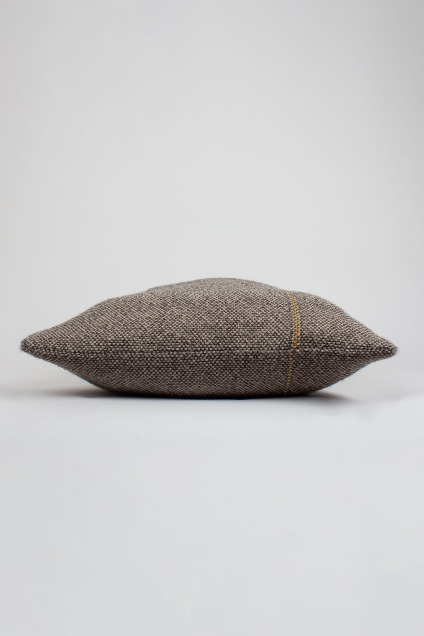Unique piece with toasted walnut alpaca warp and charcoal grey alpaca weft. Decorated with a stripe and a fine mustard-colored line.