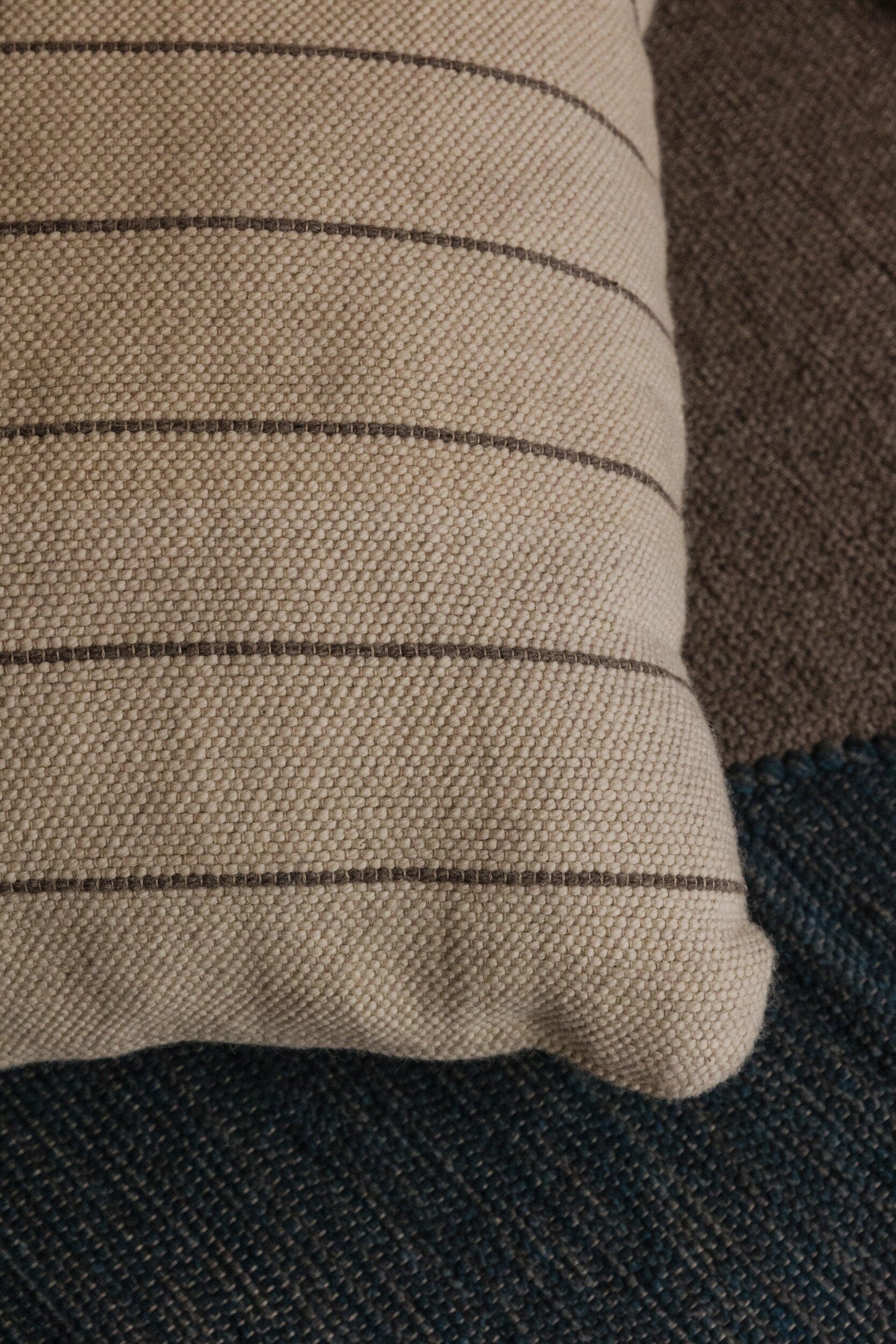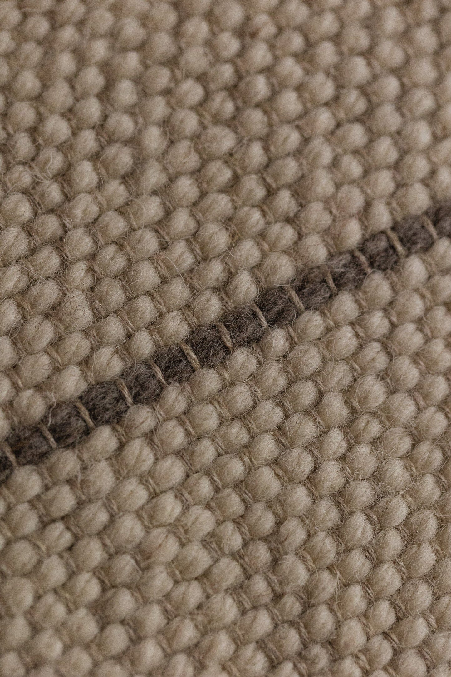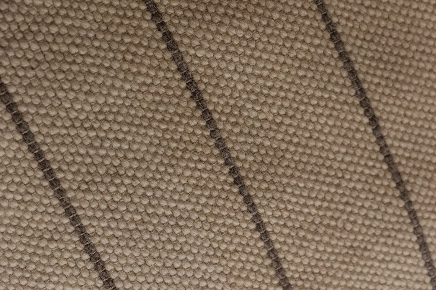 Pieza única en urdimbre de lino gris y trama de lana castellana cruda. Con diversas rayas en tono topo.