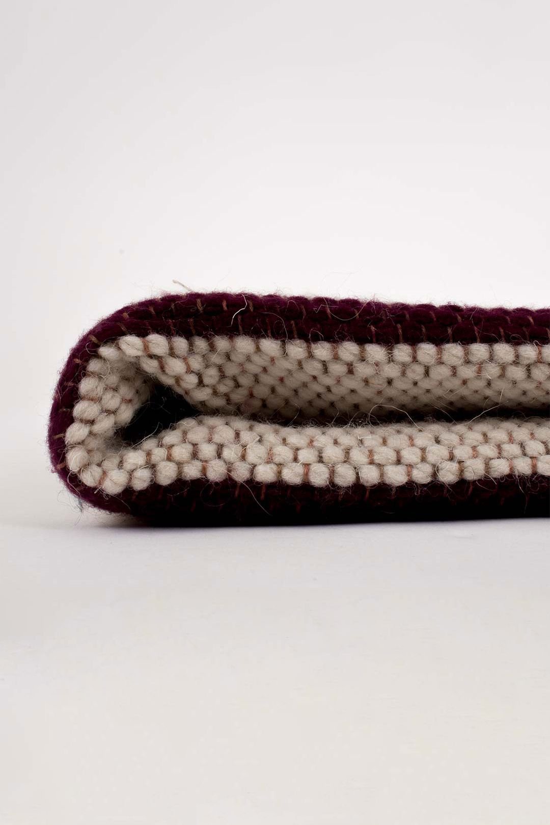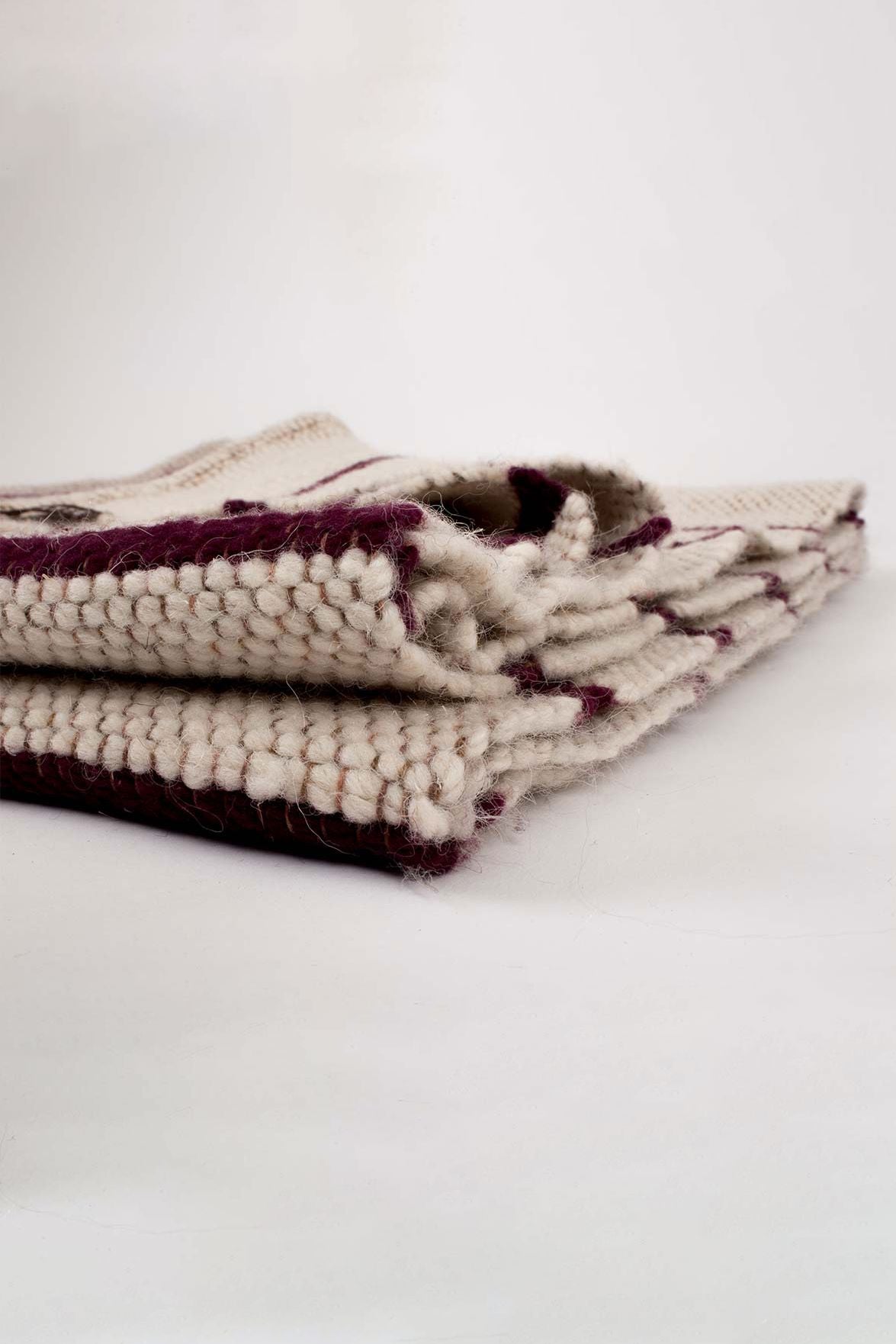 One-of-a-kind piece with a multicolored linen warp and a raw wool weft. Features aubergine-colored stripes.