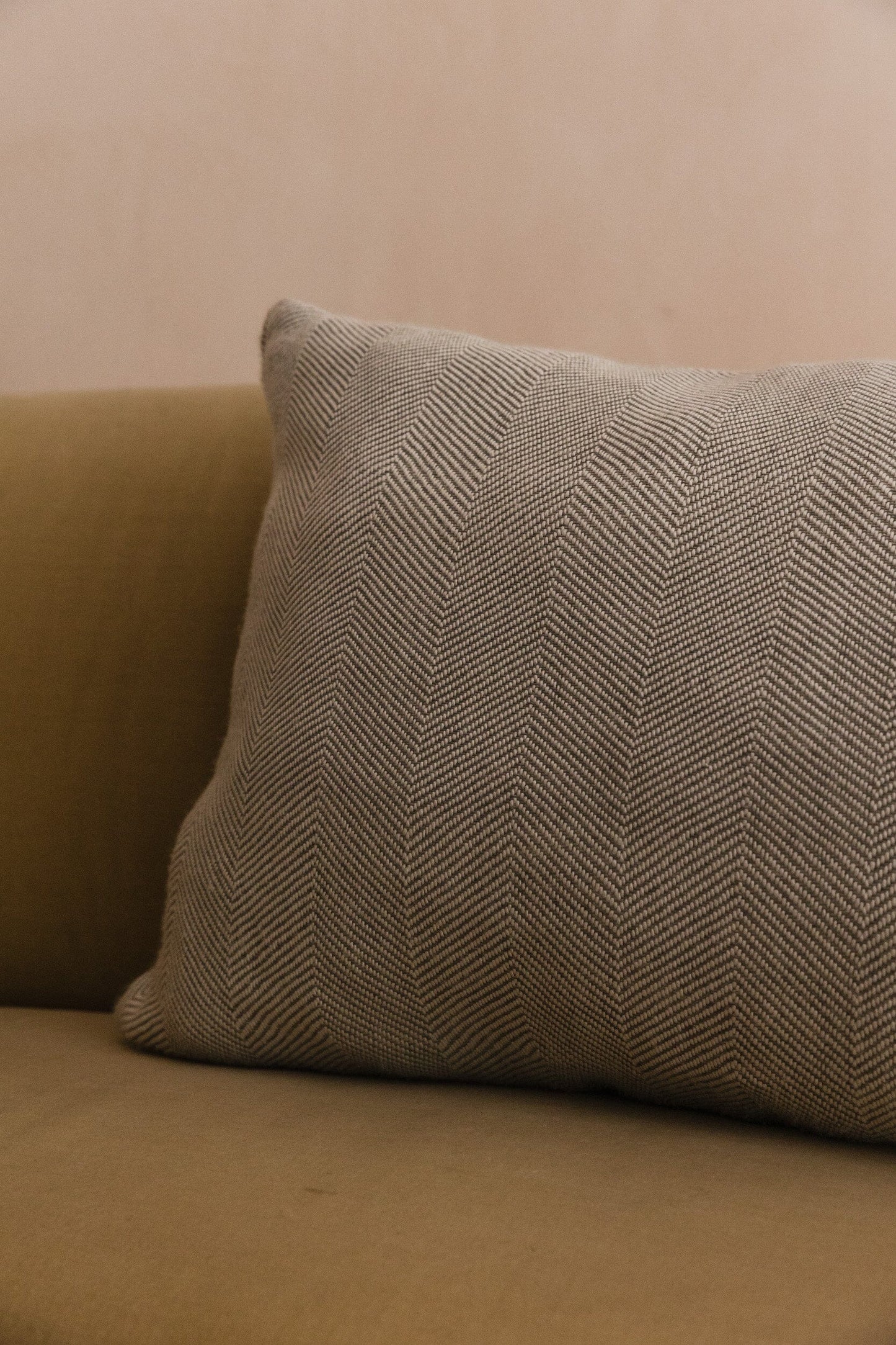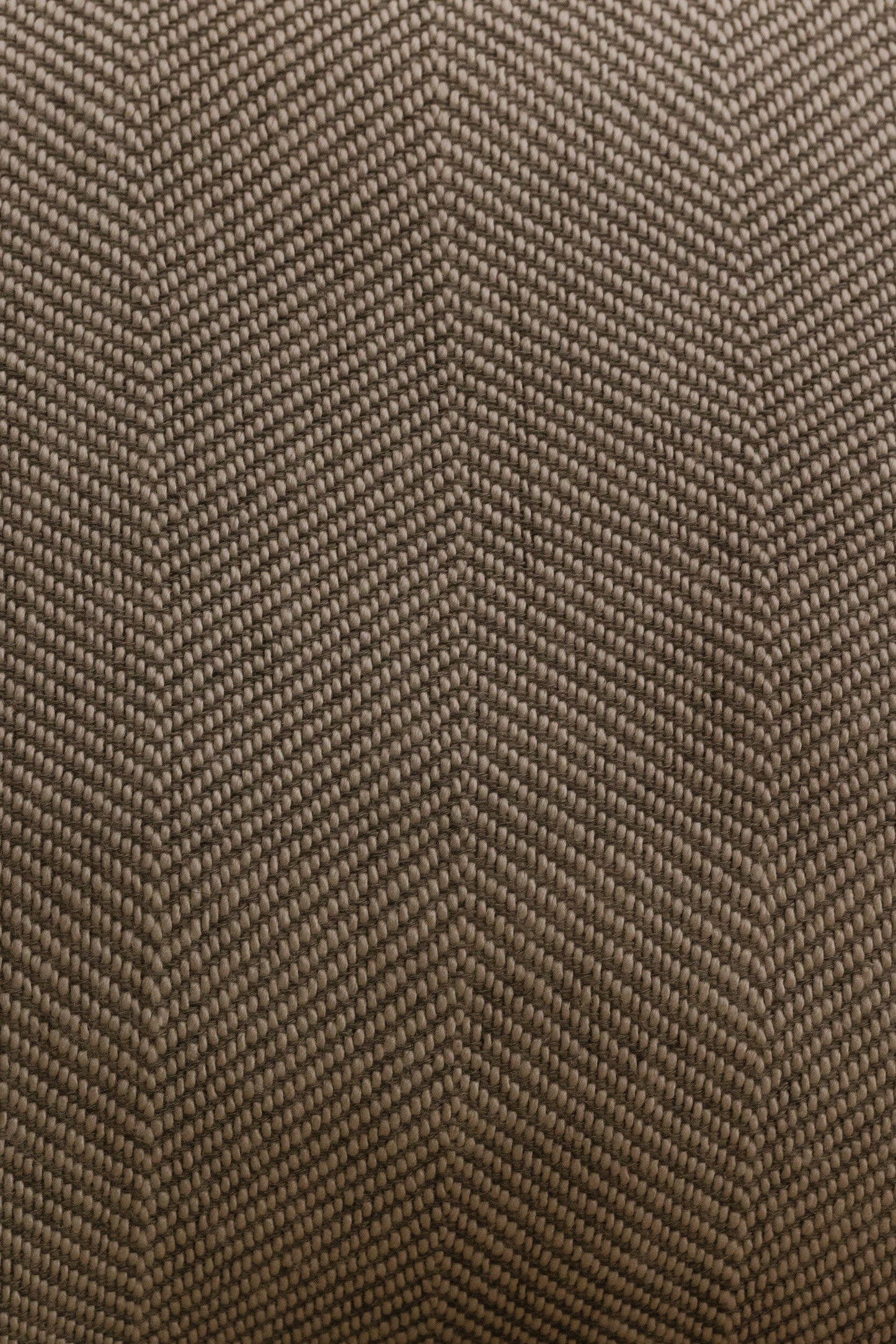 Pieza única en espiga con urdimbre de alpaca baby con seda blanca y trama de lino gris marengo verdoso.