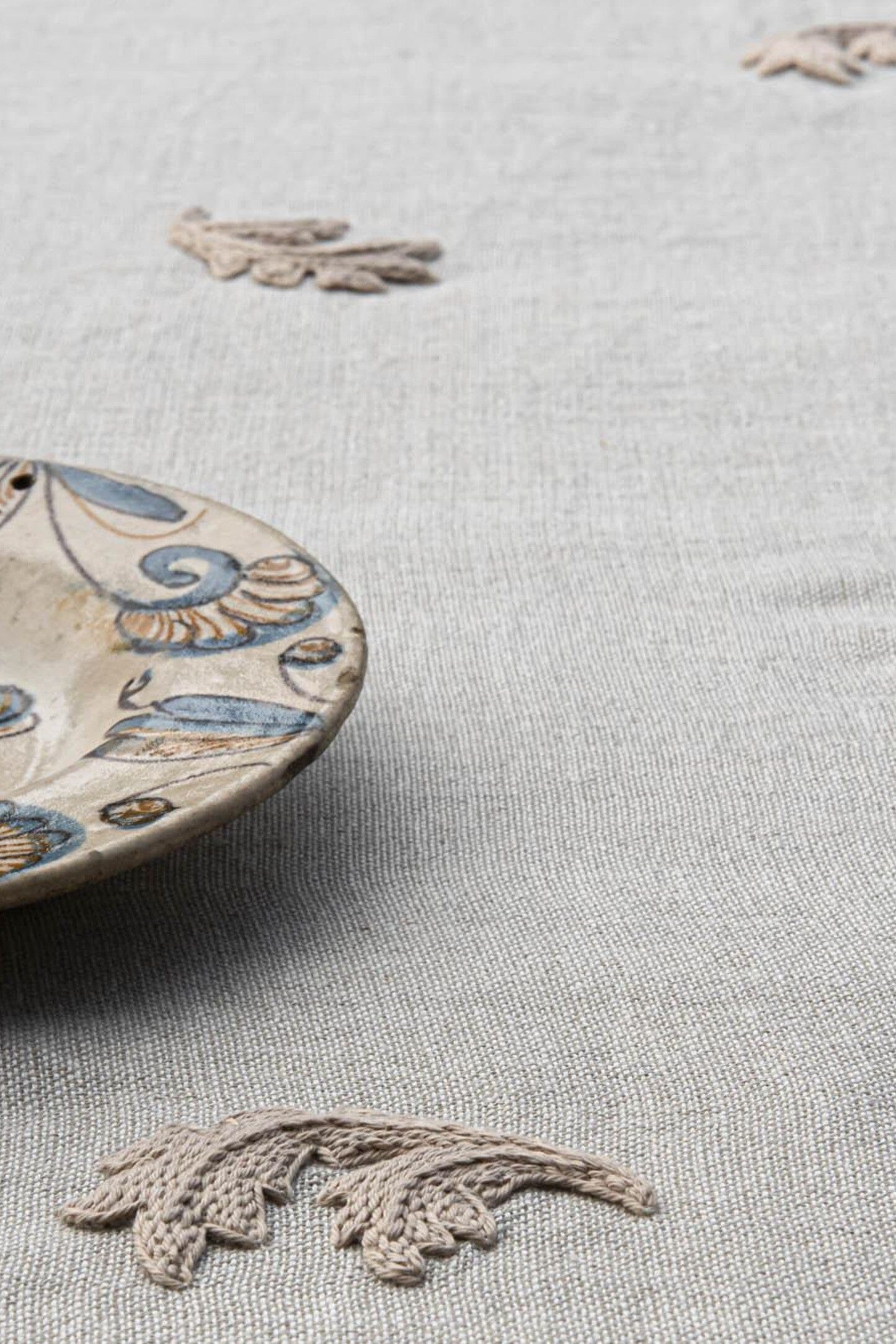 The first creative collaboration between ÁBBATTE and I L O E M A is born from the shared sensitivity and commitment of both brands to promote and preserve the exquisite legacy of Spanish textile art. This new edition of tablecloths combines ÁBBATTE’s natural-fibre handloom weaving with the raised embroidery of the ancestral goldwork technique, a hallmark of our textile art edition created with artist Blanca Muñoz and master goldwork embroiderers.