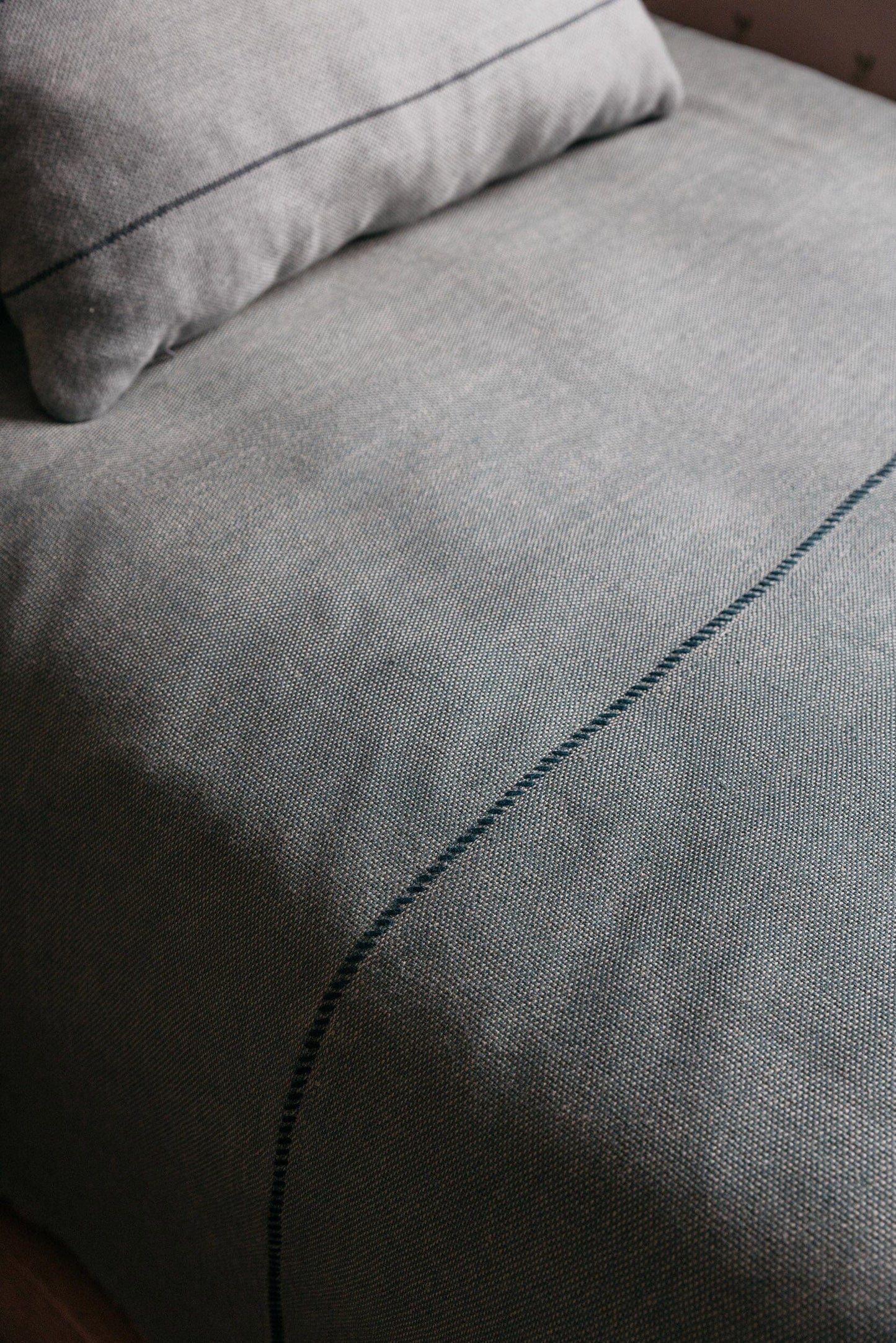 Unique piece with a grey linen warp and a celadon-green baby alpaca and silk weft. Finished with alpaca and silk seams in peacock blue.