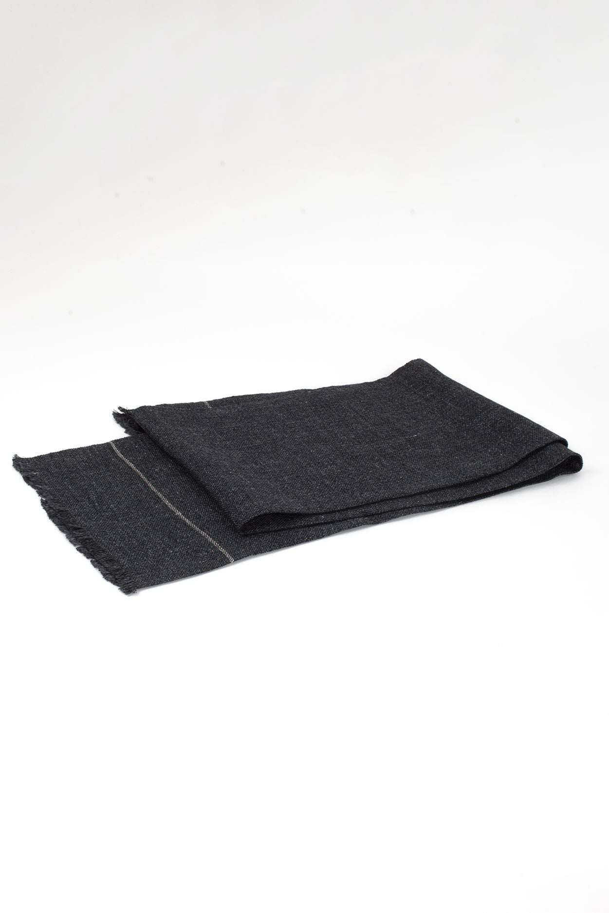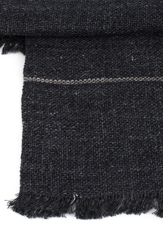 Exclusive handcrafted piece made with the finest natural fibres. Warp and weft in dark grey linen. Decorated with two fine stripes in light grey.