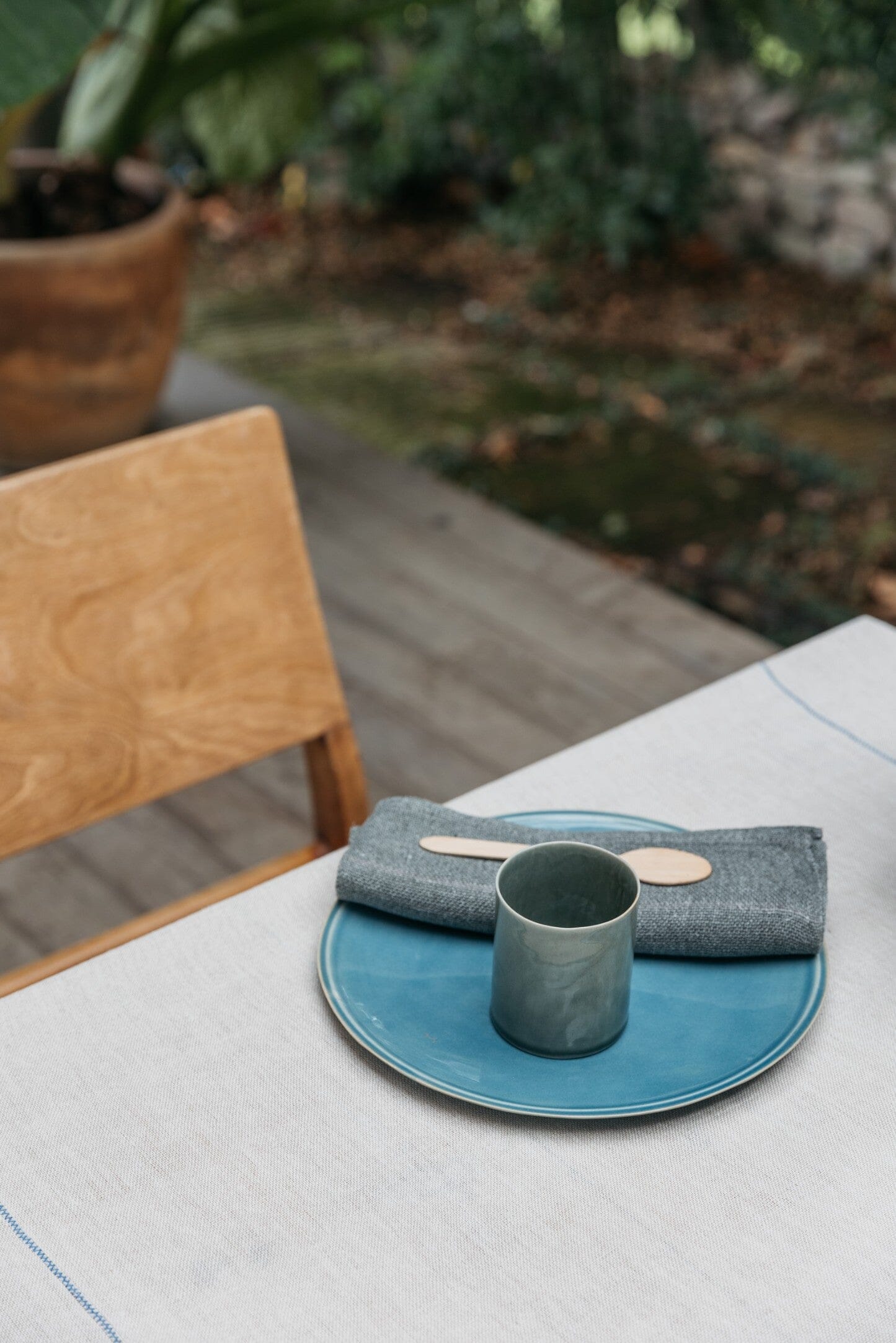 Unique piece with a bleached-grey linen warp and a white linen weft, finished with zigzag-design seams in blue.