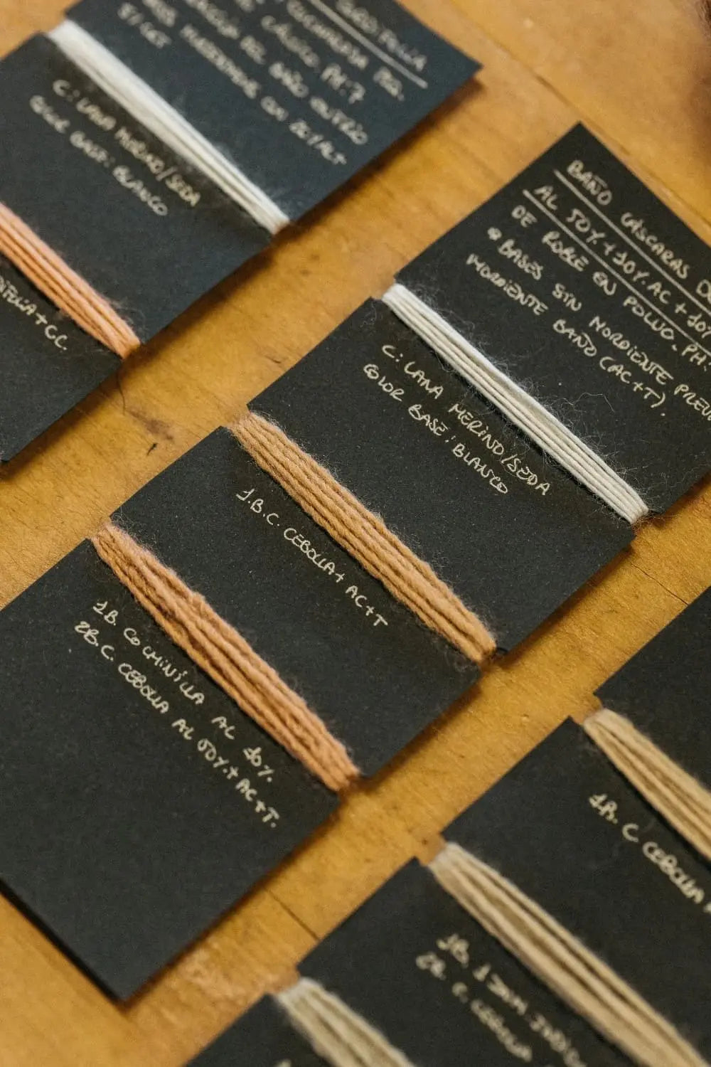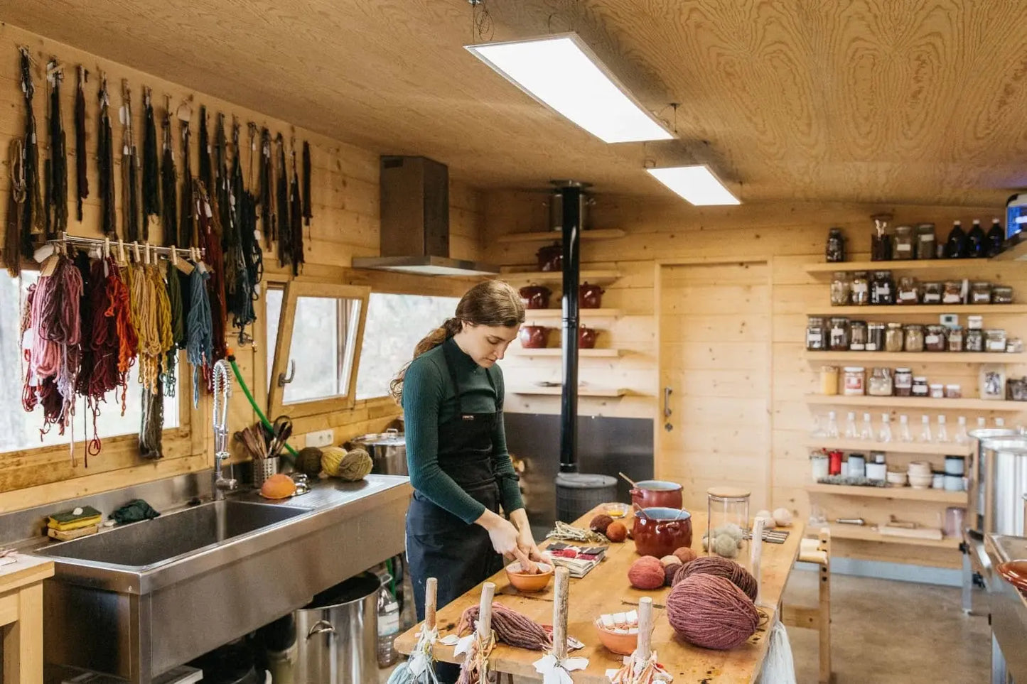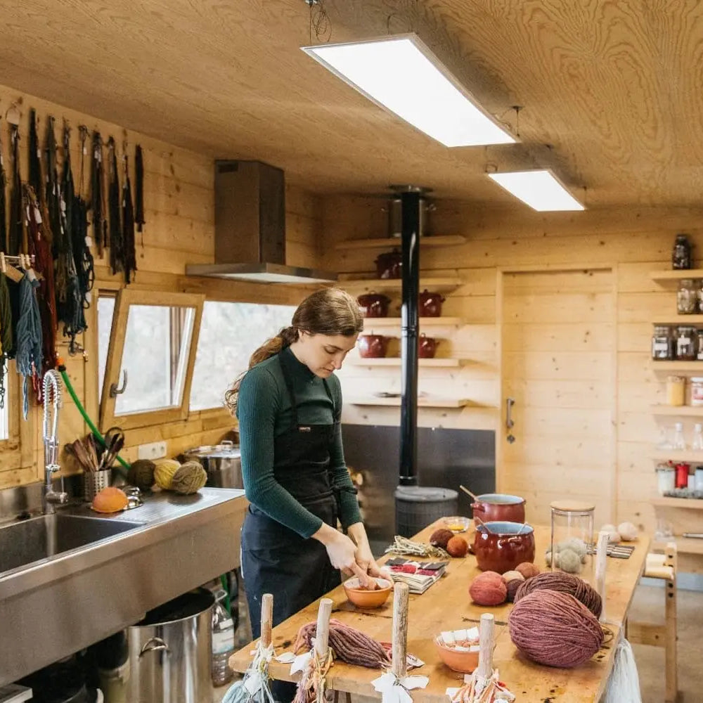 In one of our wooden cabins, yarns are dyed using pigments derived solely from plants or insects. This is a process that sits somewhere between the magical and the scientific, producing deep, nuanced, and custom-made colours. The dyeing process involves several steps: scouring to cleanse the fibre, mordanting to fix the dye, and the dye bath itself, in which pigment is applied to the threads at a specific temperature.