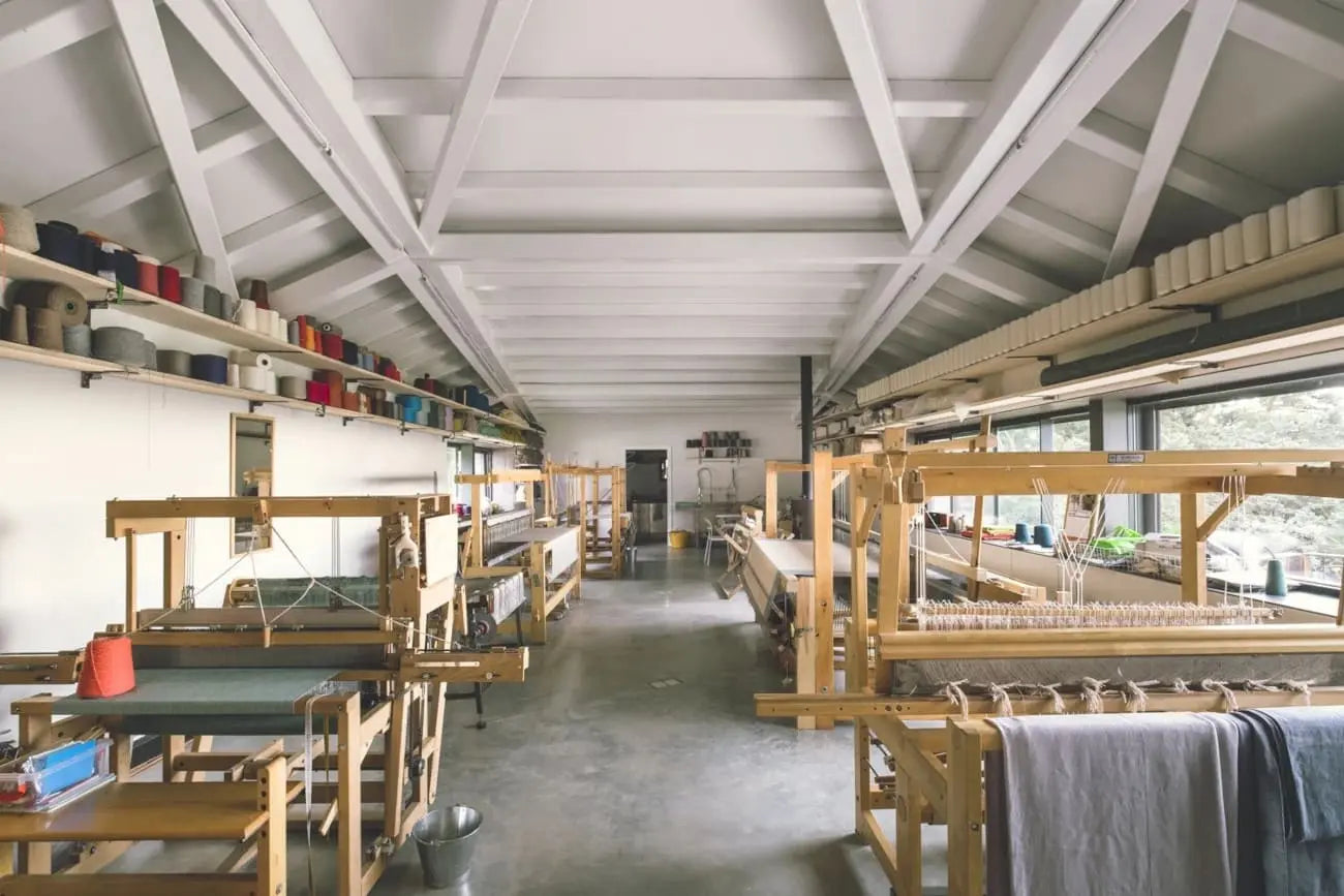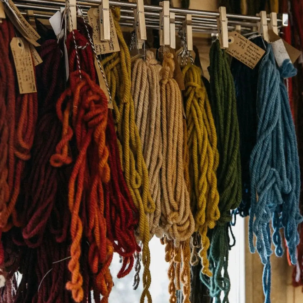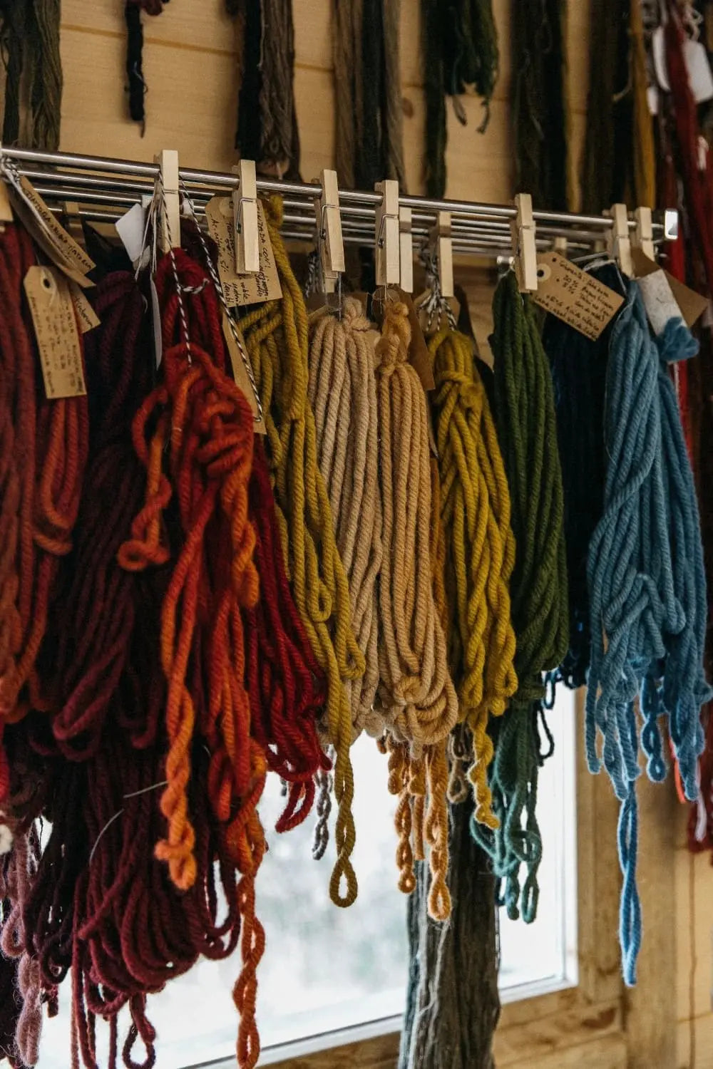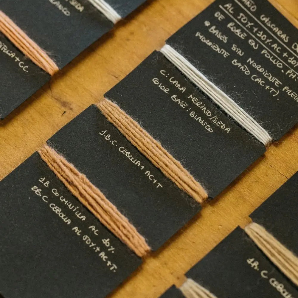 In one of our wooden cabins, yarns are dyed using pigments derived solely from plants or insects. This is a process that sits somewhere between the magical and the scientific, producing deep, nuanced, and custom-made colours. The dyeing process involves several steps: scouring to cleanse the fibre, mordanting to fix the dye, and the dye bath itself, in which pigment is applied to the threads at a specific temperature.