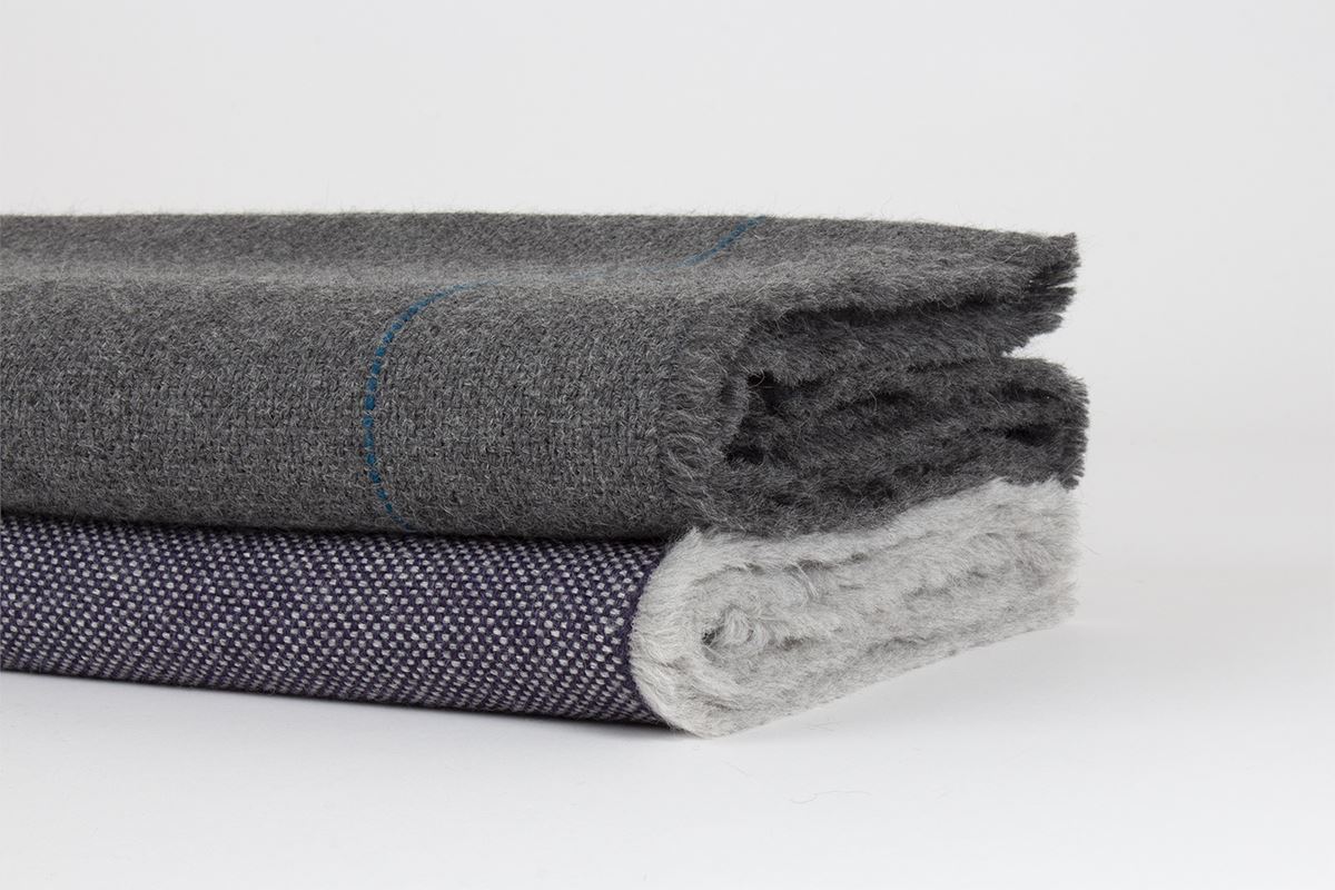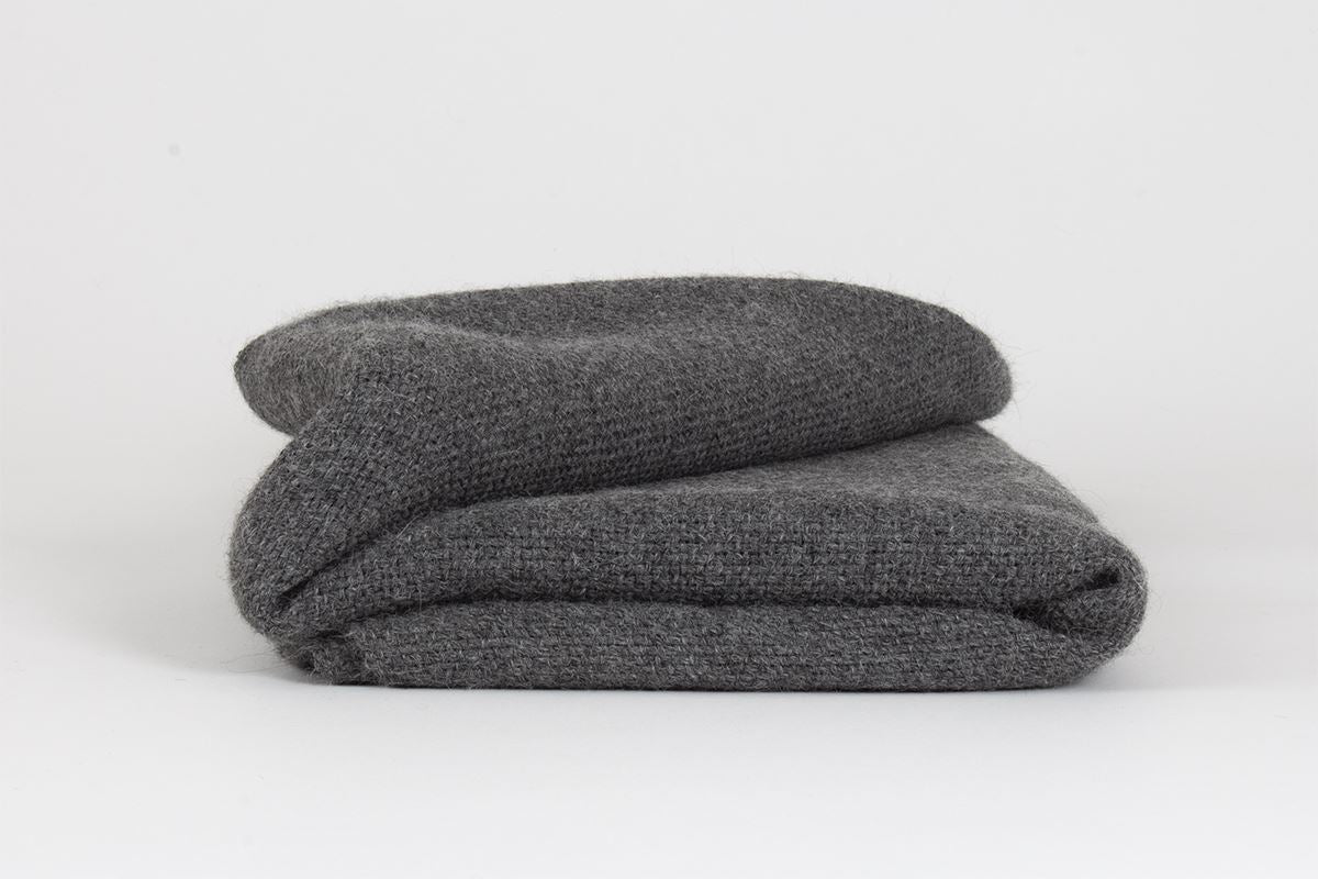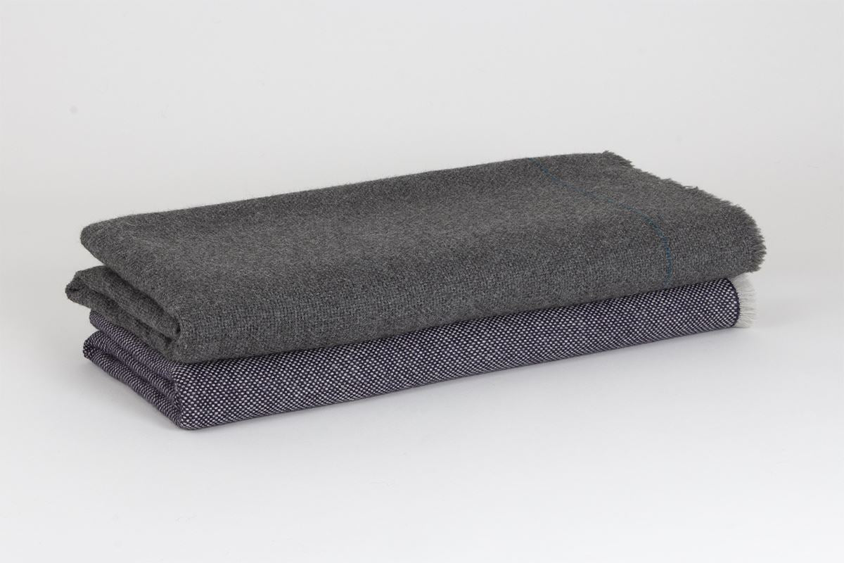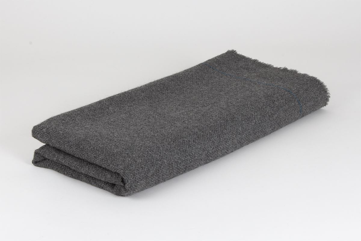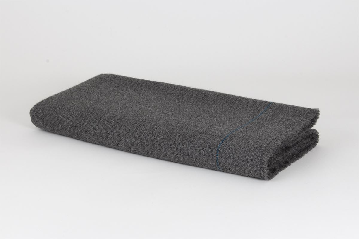 Exclusive piece, handcrafted from the finest natural fibers. Features a charcoal-grey alpaca warp and weft, finished with a fine peacock-blue stripe.