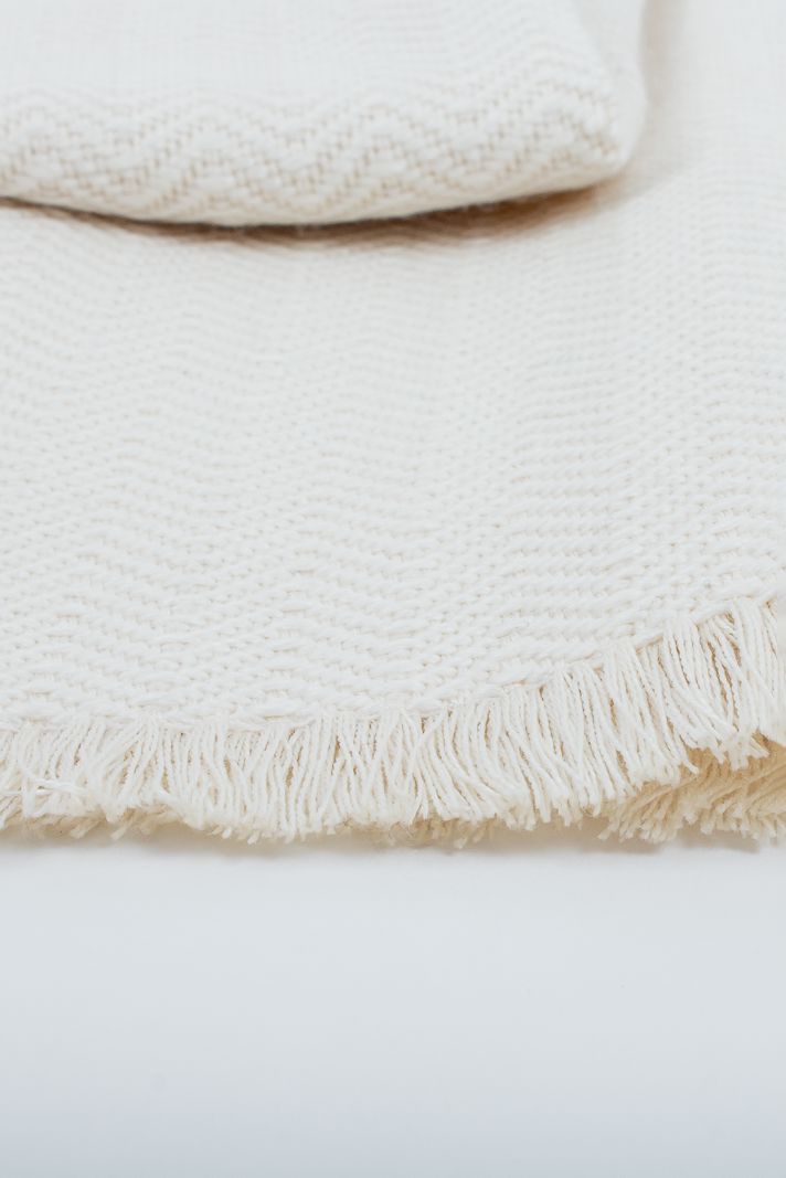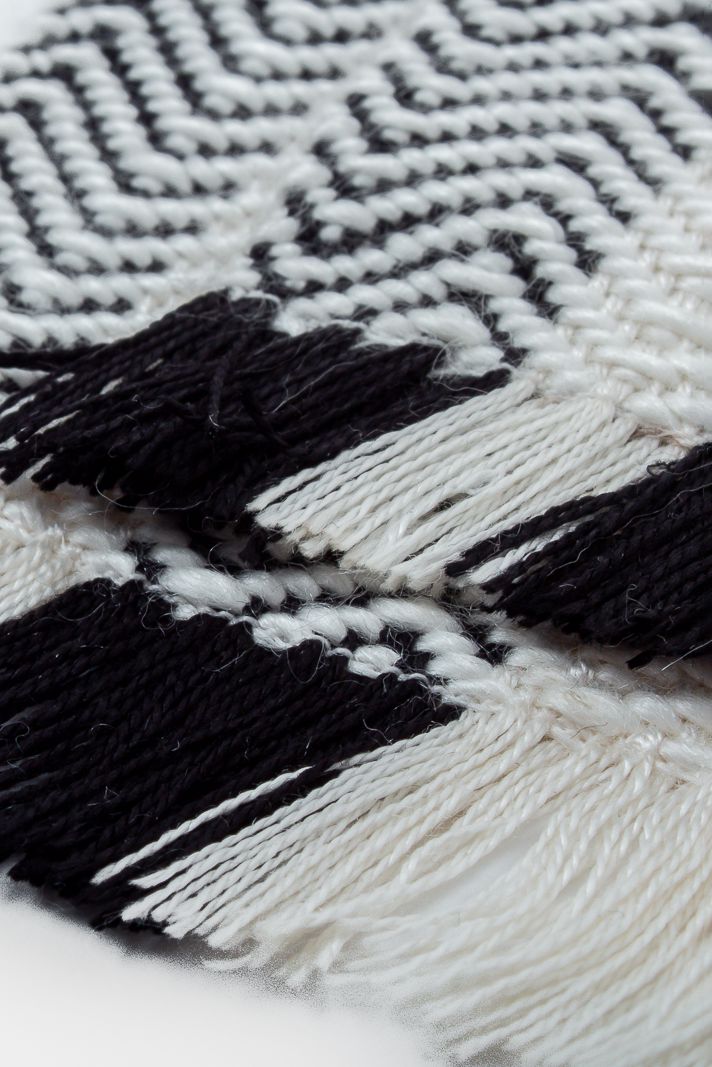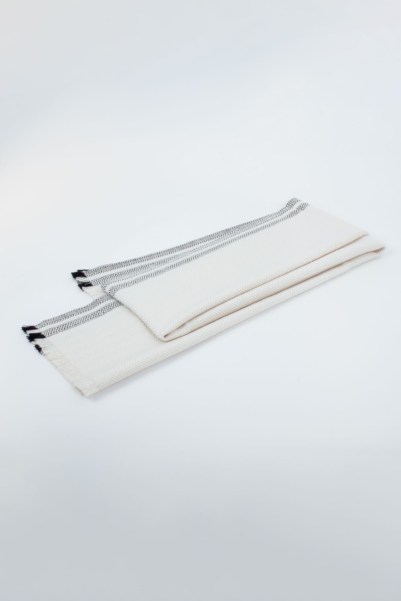 Unique piece with warp in white silk and weft in white merino wool. Decorated with black stripes on the sides.
