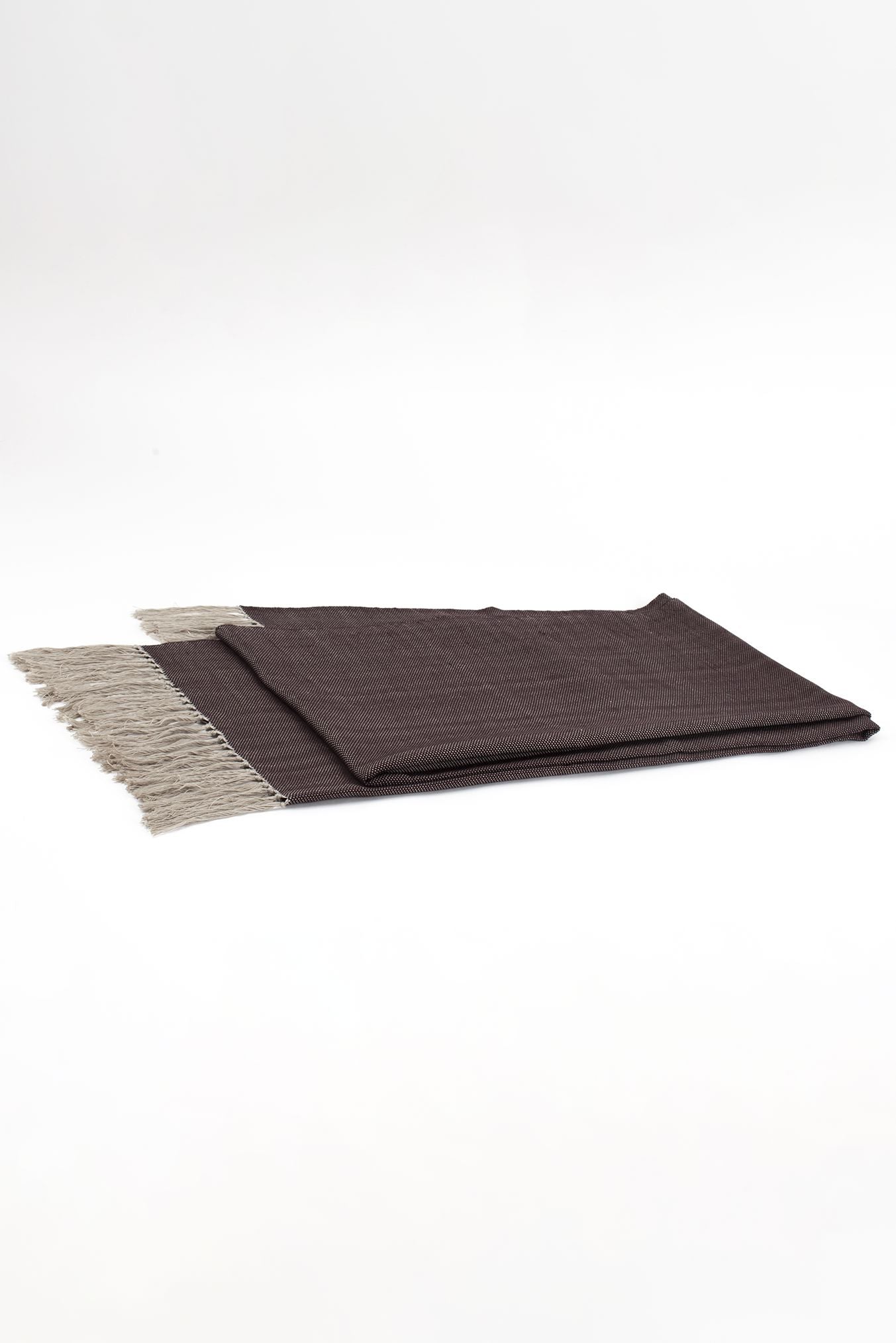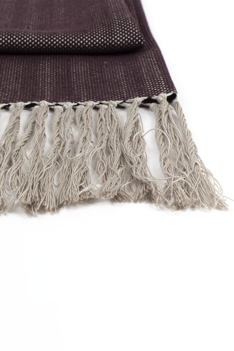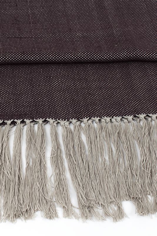 Exclusive piece handcrafted with top-quality natural fibers. Featuring an ash-colored silk warp and an aubergine-colored silk weft. Finished with fringes.
