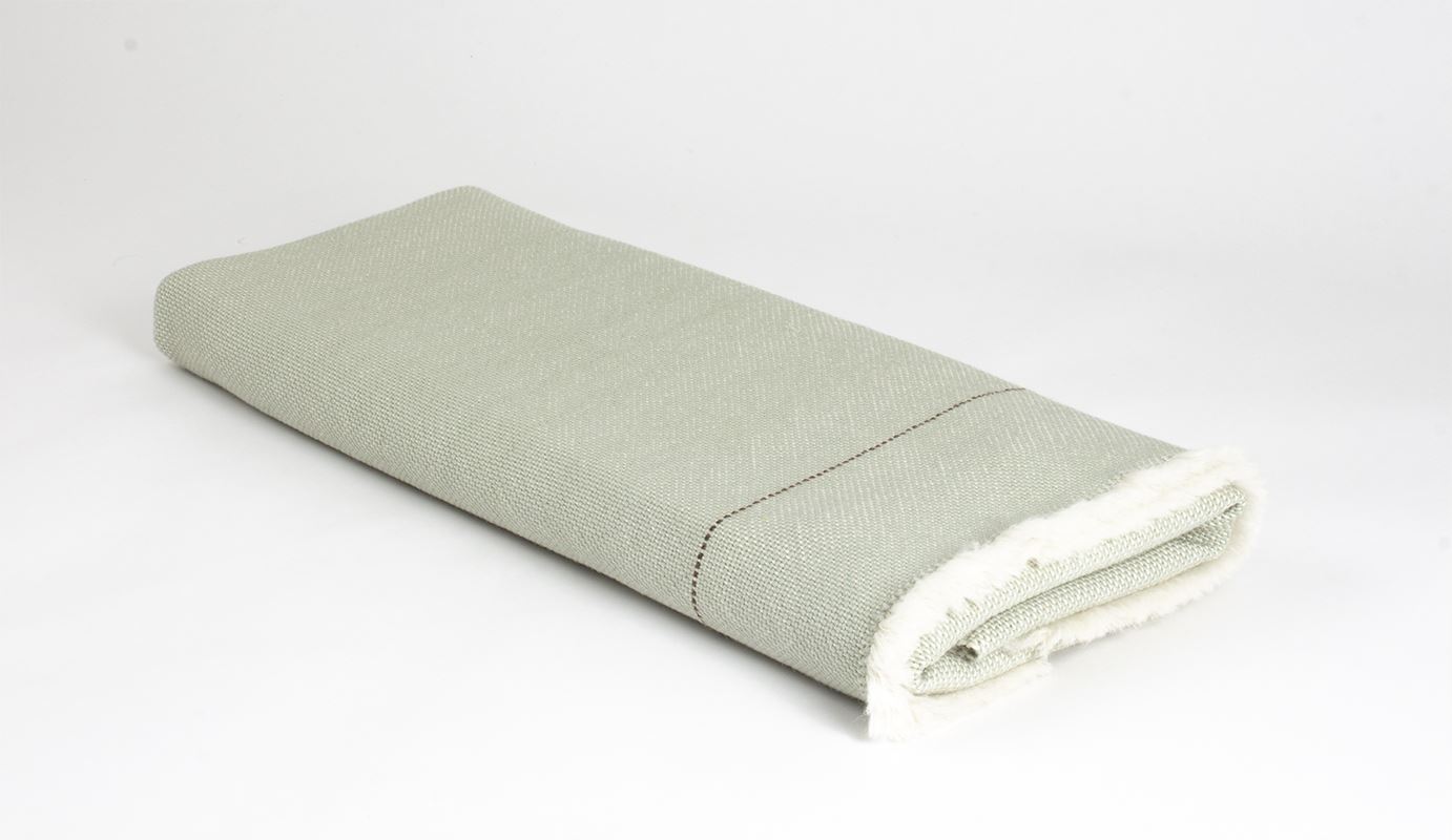Pieza exclusiva elaborada de manera artesanal con fibras naturales de la mejor calidad. Manta en urdimbre de alpaca cruda y trama de lana merino verde claro. Decorada con una raya color tabaco.