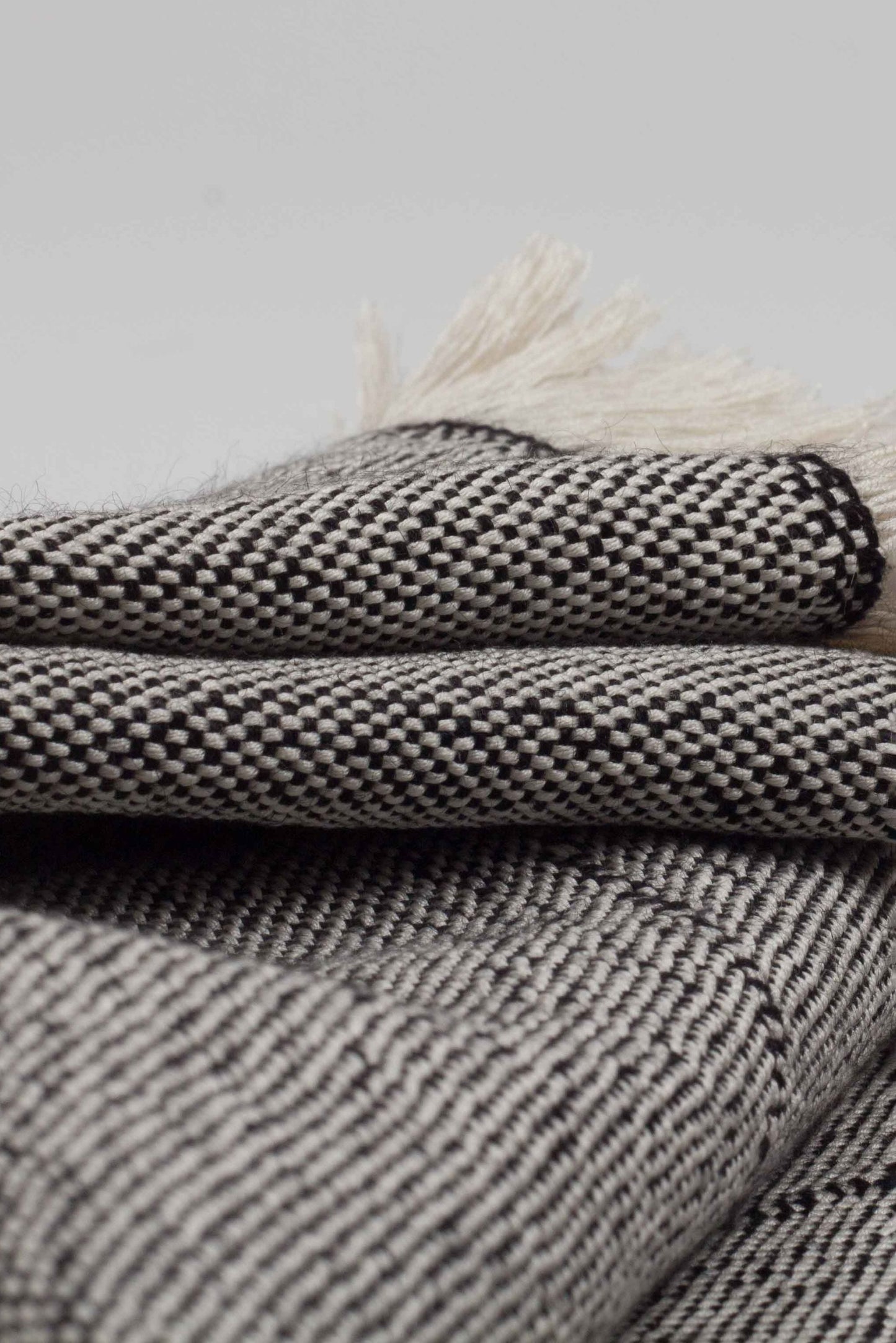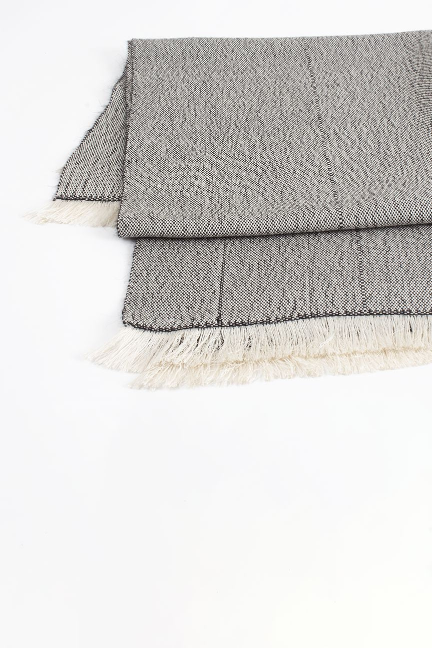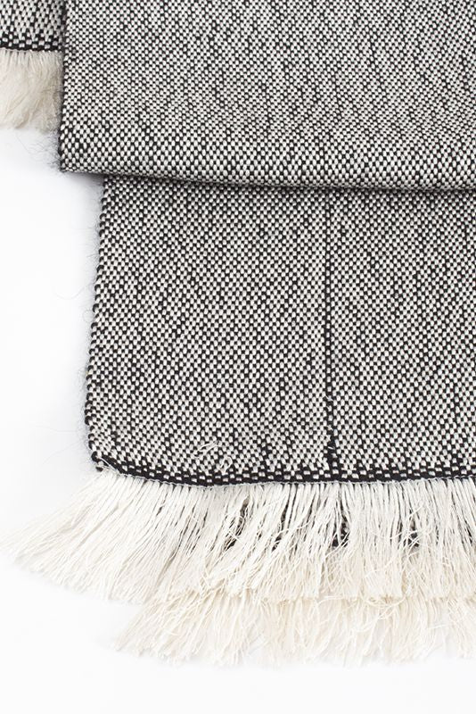 Unique piece with white silk warp and black silk weft. Decorated with vertical black stripes.