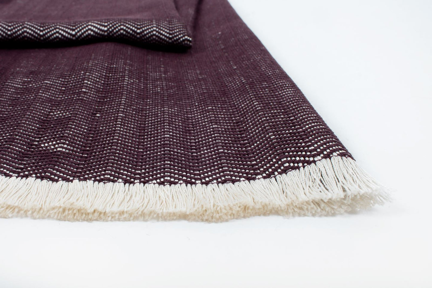 Unique piece with a white silk warp and an aubergine purple silk weft. Decorated with black side stripes.